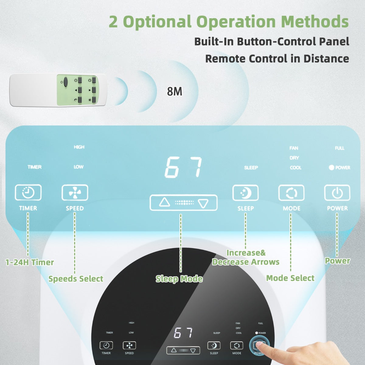 This 2640W portable air conditioner can deliver strong, clean and fresh cooling air for rooms up to 15-30?, suitable for living rooms, bedrooms, and offices. This multi-purpose 3-in-1 air conditioner quickly and easily improves cooling efficiency and maintains room temperature between 16? and 31?. You can choose the desired mode among cooling, dehumidifying, and high and low-speed fan modes according to your needs. In addition, the quiet sleep mode and 1-24 hour timer allow you to enjoy a restful and comfortable sleep while also saving energy bills. This portable air conditioner can be easily controlled through the easy-to-use digital control panel or wireless remote. And the 4 rolling casters and built-in handles allow you to move the portable AC unit anywhere around your home.