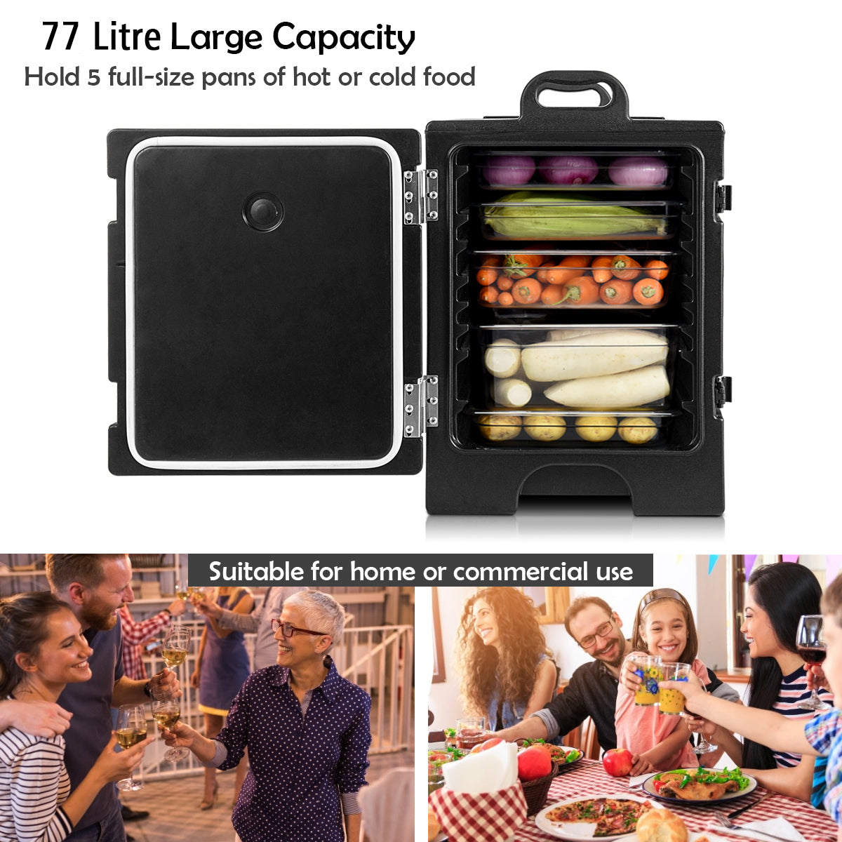 Large Capacity for Versatile Use: This food pan carrier with 77 L large capacity can hold 5 full-size food pans of hot or cold food. And various intervals allow you to place different sizes of food trays as needed. It can store all kinds of hot and cold dishes, which is ideal for canteens, restaurants, large-scale hotels, corporate gatherings, etc.