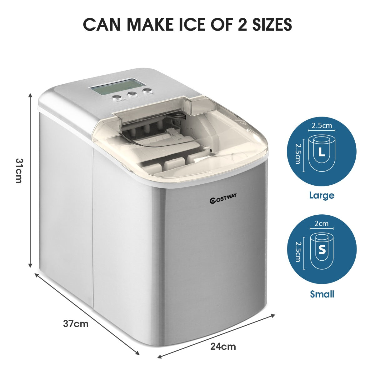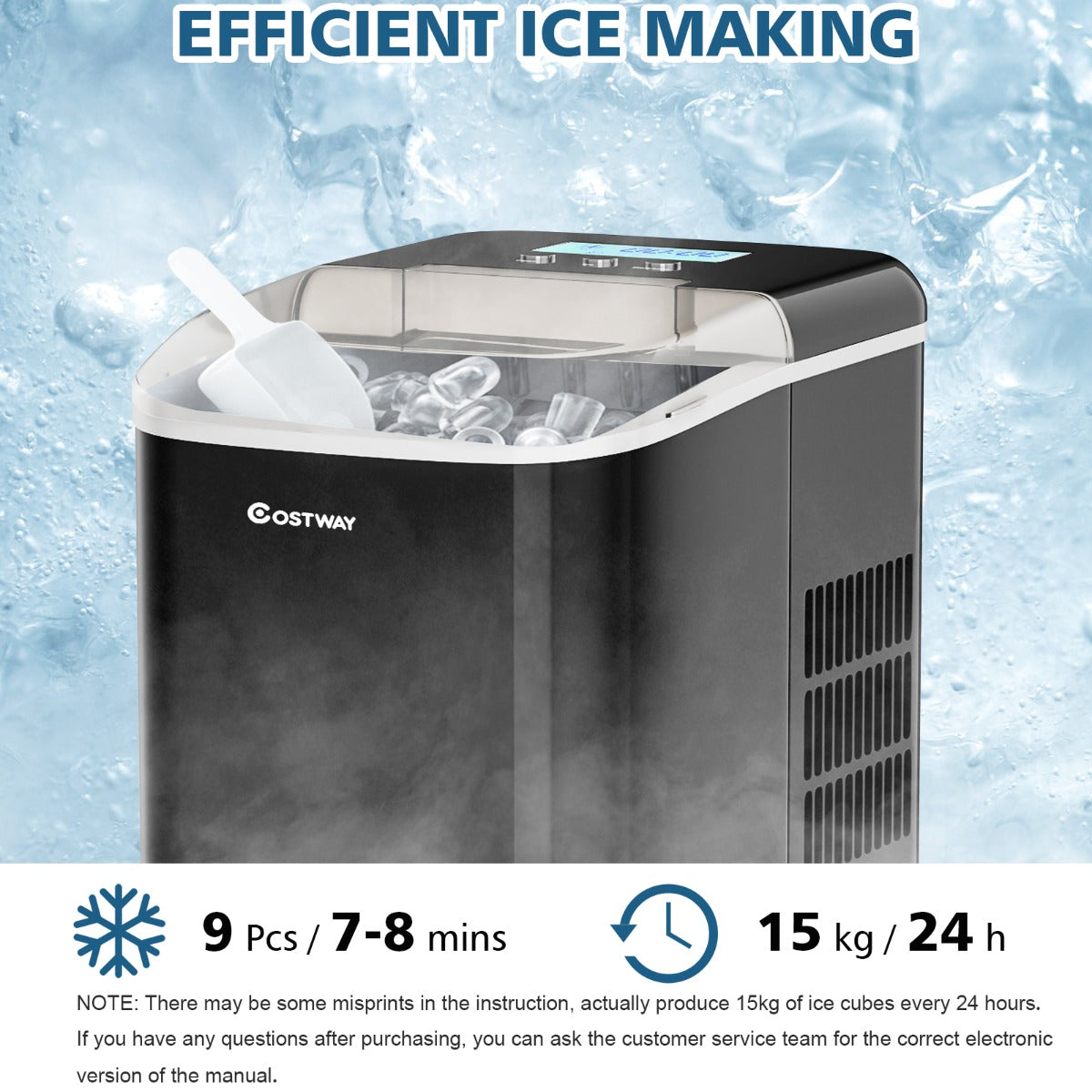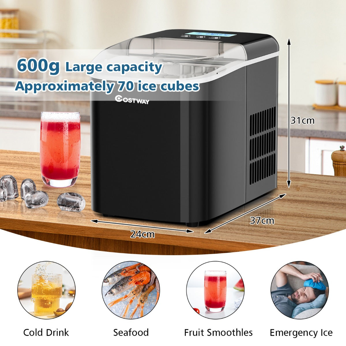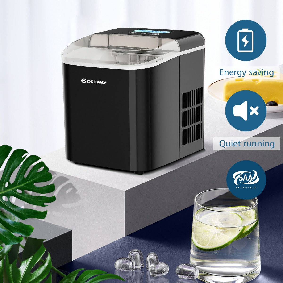 High-efficiency compressor and R600a refrigerant ensure fast ice making speed. It can produce 9 bullet-shaped ice cubes every 7-8 minutes and make 15kg ice per day. You can put those bullet-shaped ice cubes in iced food, smoothies or cold drinks. Those ice cubes can also be used for first aid. In addition, with intuitive control panel and LCD display, our ice maker is easy to use. You can choose different ice sizes (small or large), see the ice making time and status. Besides, it's equipped with different indicator icons to show when the ice is full and when you need to add water. Its self-cleaning function also brings much convenience. Moreover, with food-grade ABS and PP material, the ice maker is non-toxic,odorless and harmless to your health. SAA certification ensures more security. You can use our ice maker in kitchen, office, restaurant, bar, cafe, etc. Furthermore, visible window, ice scoop and removable ice bucket help you to use and clean it without effort.