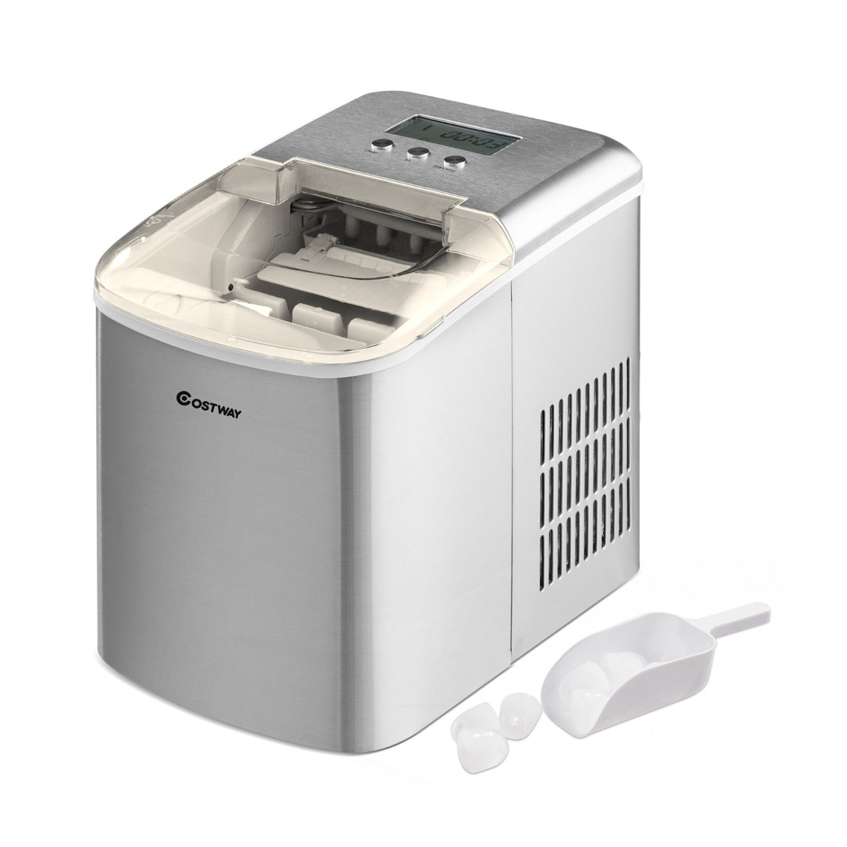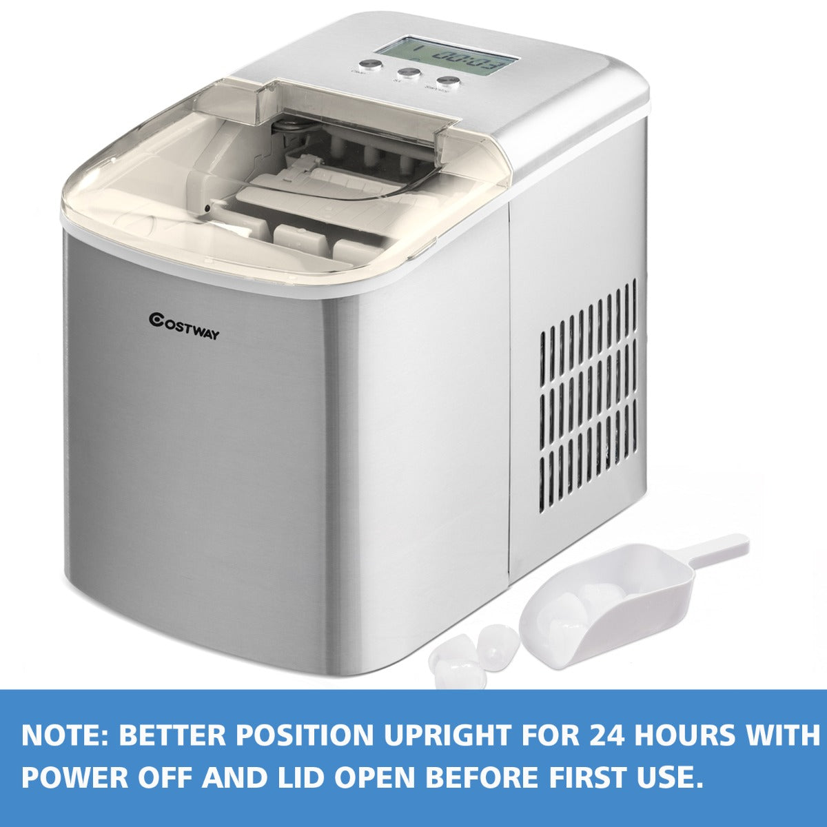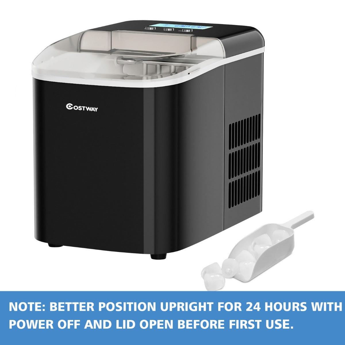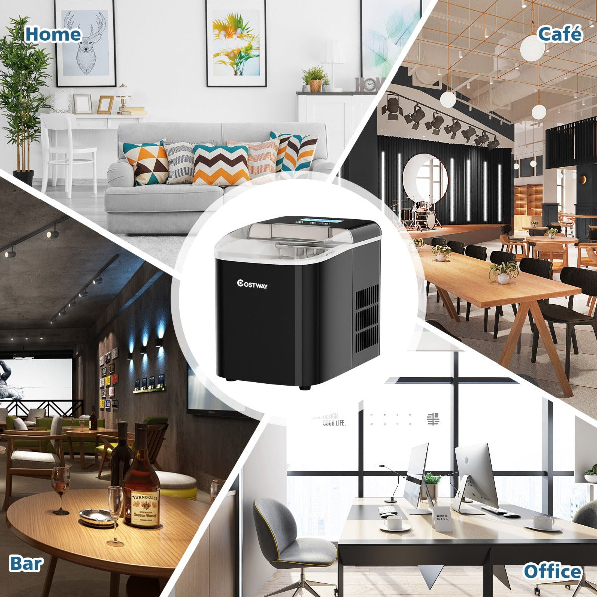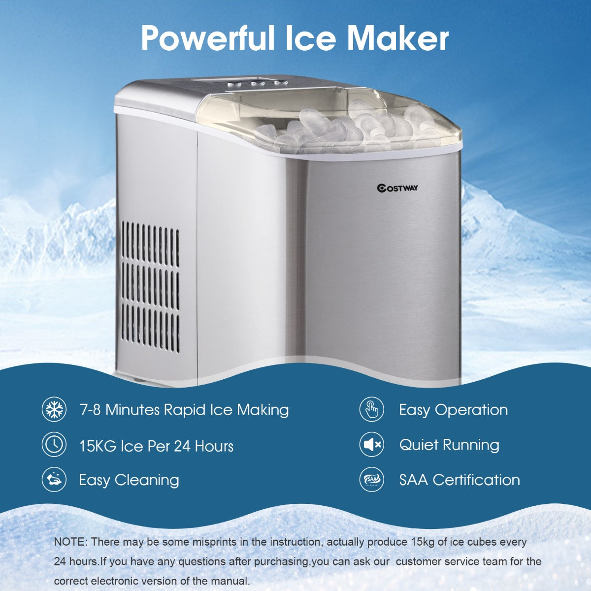 High-efficiency compressor and R600a refrigerant ensure fast ice making speed. It can produce 9 bullet-shaped ice cubes every 7-8 minutes and make 15kg ice per day. You can put those bullet-shaped ice cubes in iced food, smoothies or cold drinks. Those ice cubes can also be used for first aid. In addition, with intuitive control panel and LCD display, our ice maker is easy to use. You can choose different ice sizes (small or large), see the ice making time and status. Besides, it's equipped with different indicator icons to show when the ice is full and when you need to add water. Its self-cleaning function also brings much convenience. Moreover, with food-grade ABS and PP material, the ice maker is non-toxic,odorless and harmless to your health. SAA certification ensures more security. You can use our ice maker in kitchen, office, restaurant, bar, cafe, etc. Furthermore, visible window, ice scoop and removable ice bucket help you to use and clean it without effort.