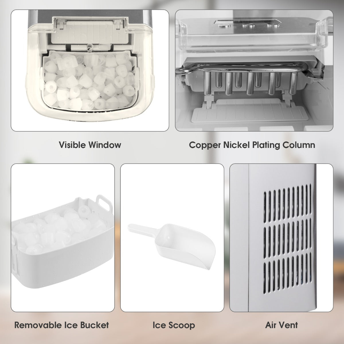 Easy Use & User-friendly Design: To enjoy the ice, you need to pour water into the water tank and press the start button. Then, after a while, you can remove the ice with provided scoop. We design it with visible window for you to see the ice condition. Removable ice bucket allows you to easily take out all ice cubes.