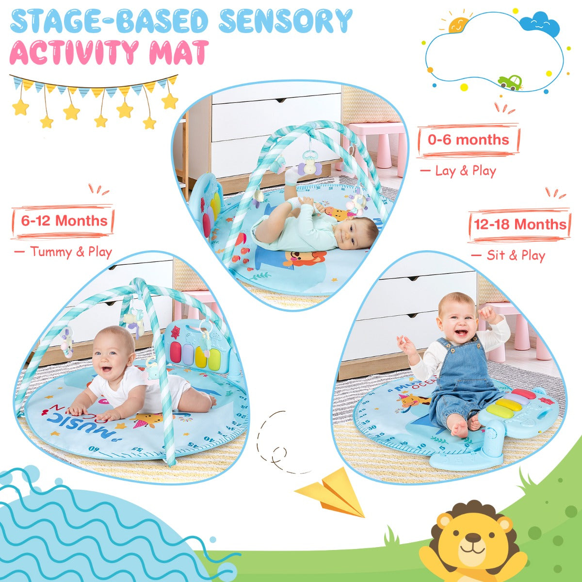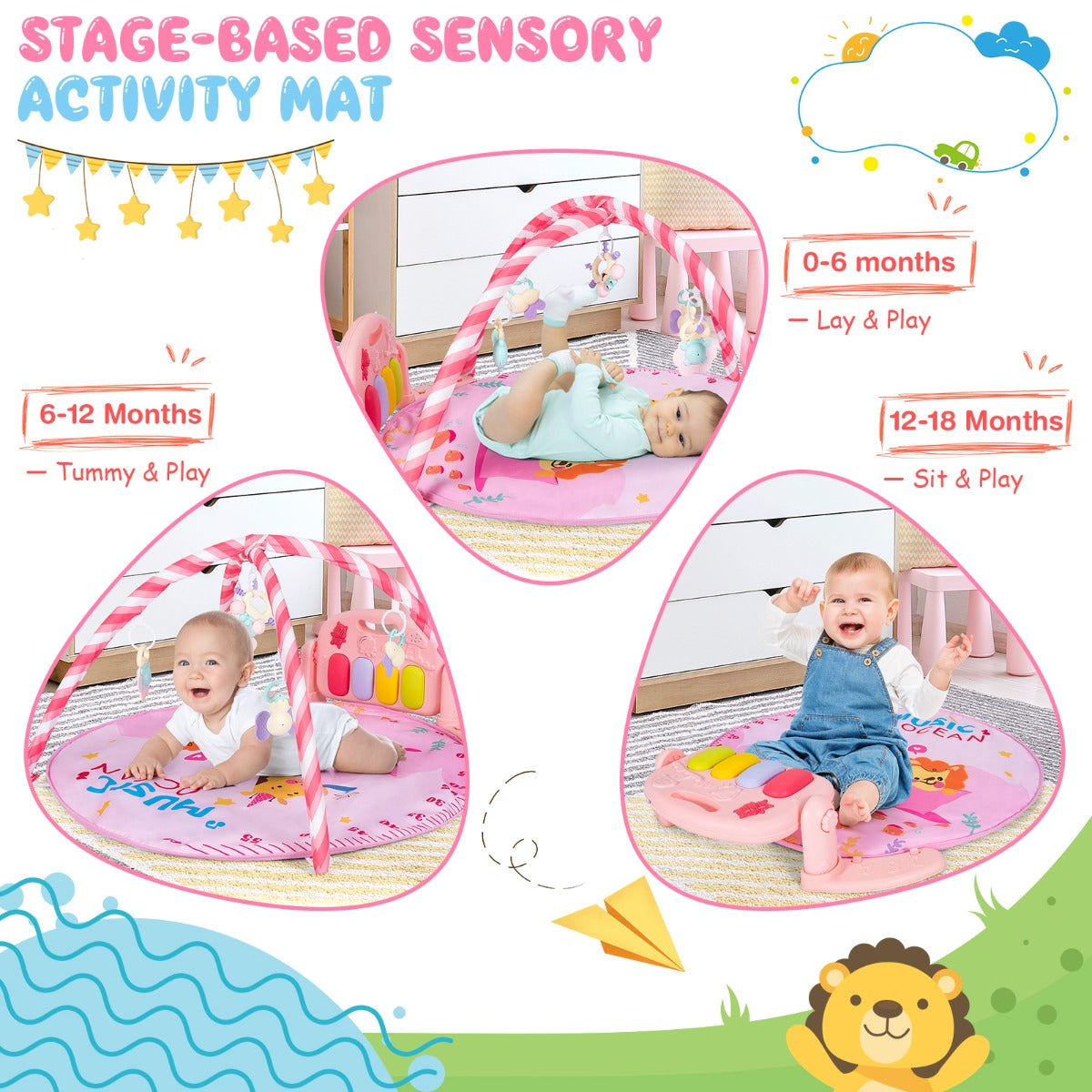 Sensory Toy for Year's Companionship This colorful piano gym mat is an ideal sensory toy for newborns lifting their heads to toddlers learning how to walk. It has 4 stages of play--lay & play, tummy time, sit & play, take-along, as the baby's little ego starts to emerge.