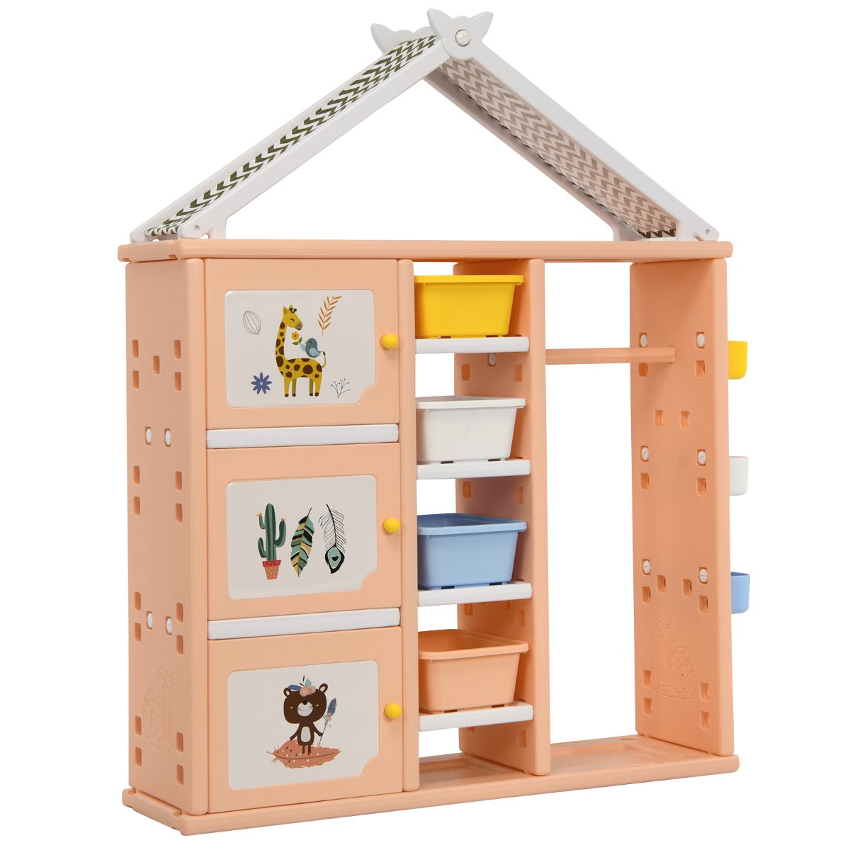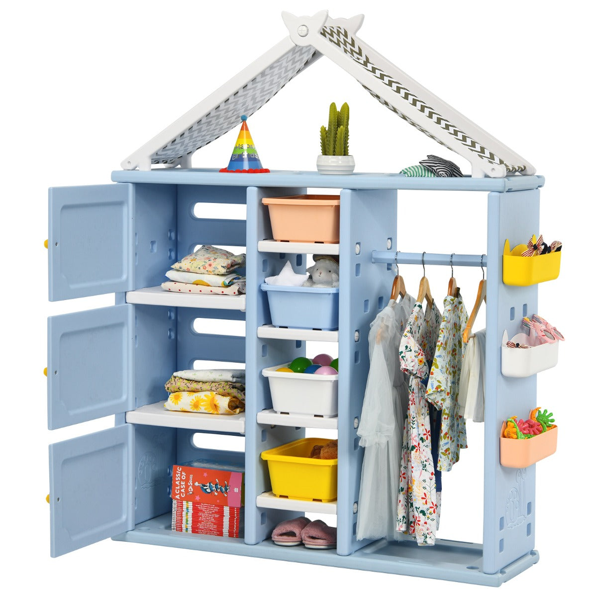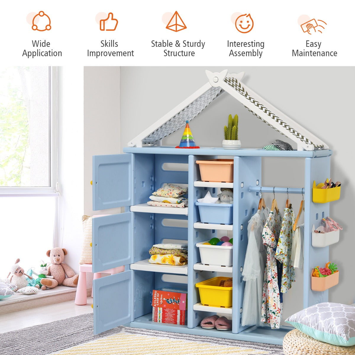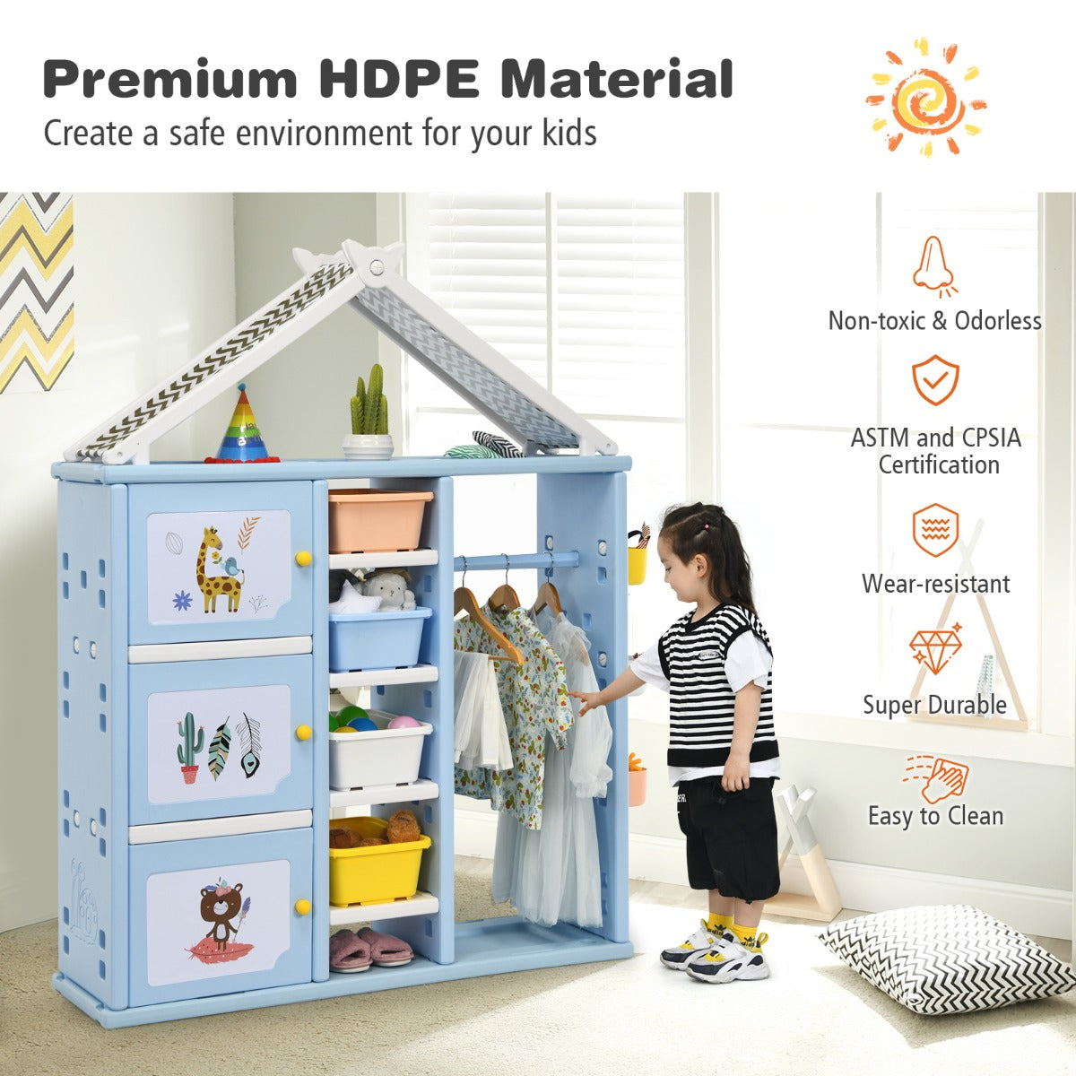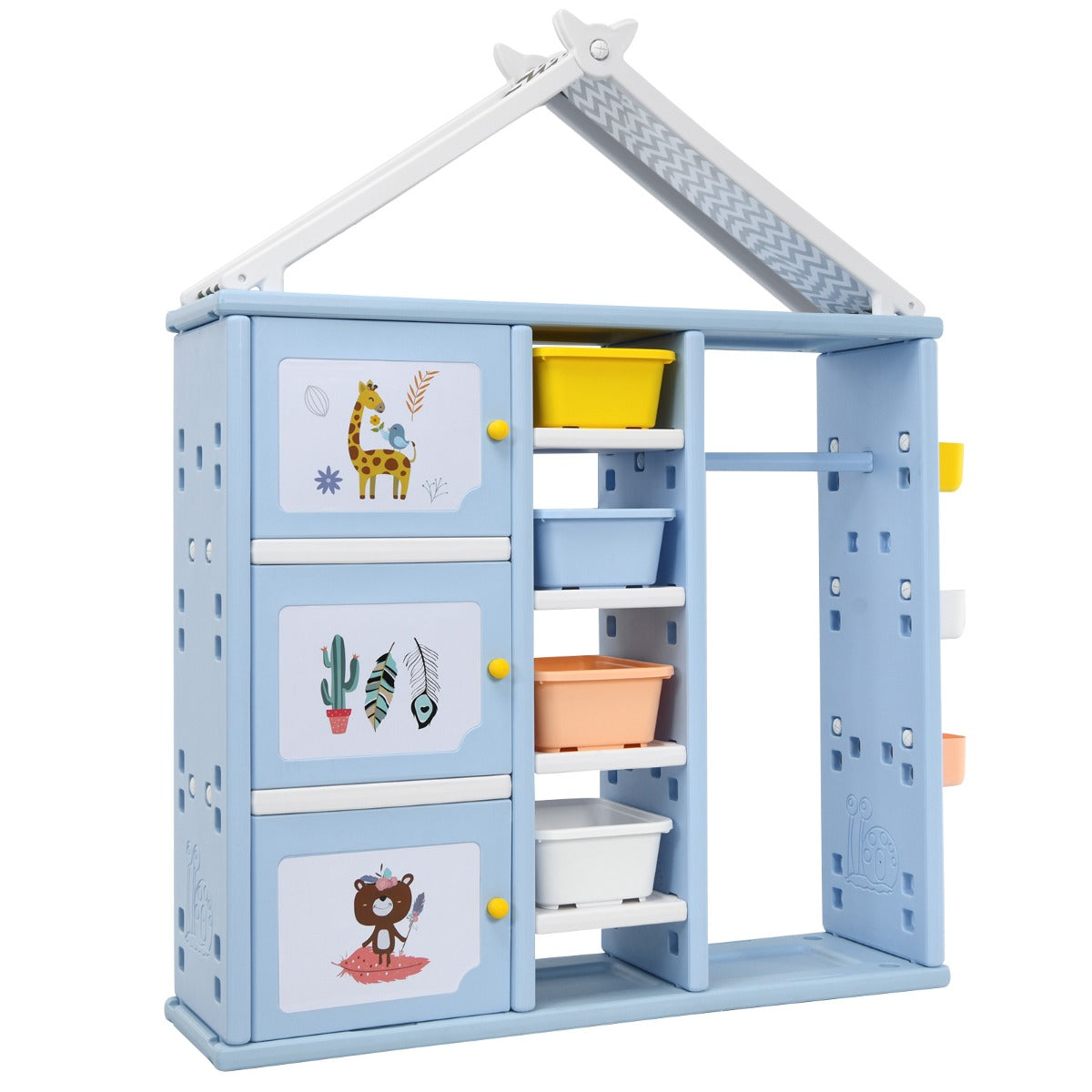 Made of premium HDPE, the whole storage organizer closet is stable and has good weight capacity. Meanwhile, it's safe for kids to use thanks to its anti-toppling device which can attach it to the wall tightly. Besides, its house-like appearance and bright colors add loveliness to your kid's room, making your child fall in love with tidying up.