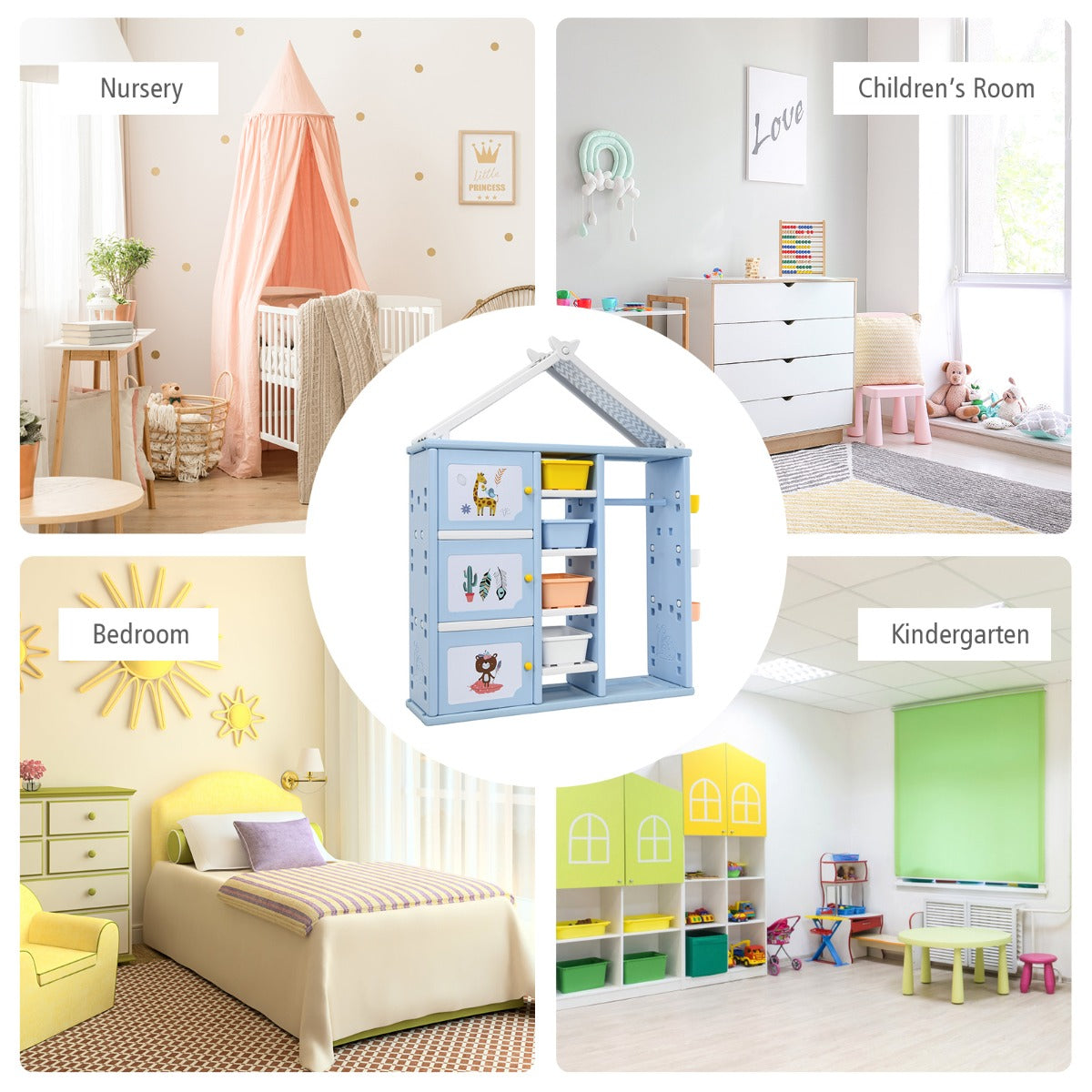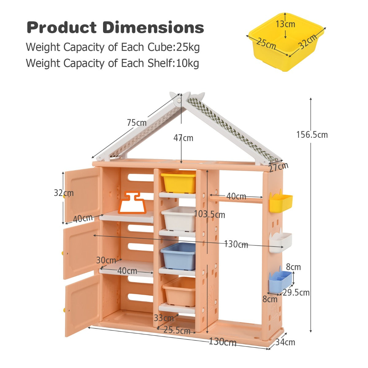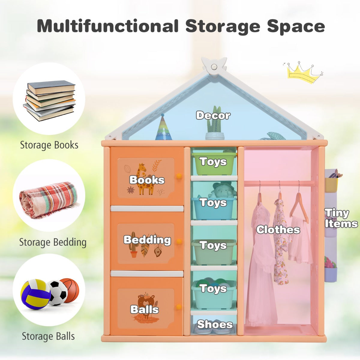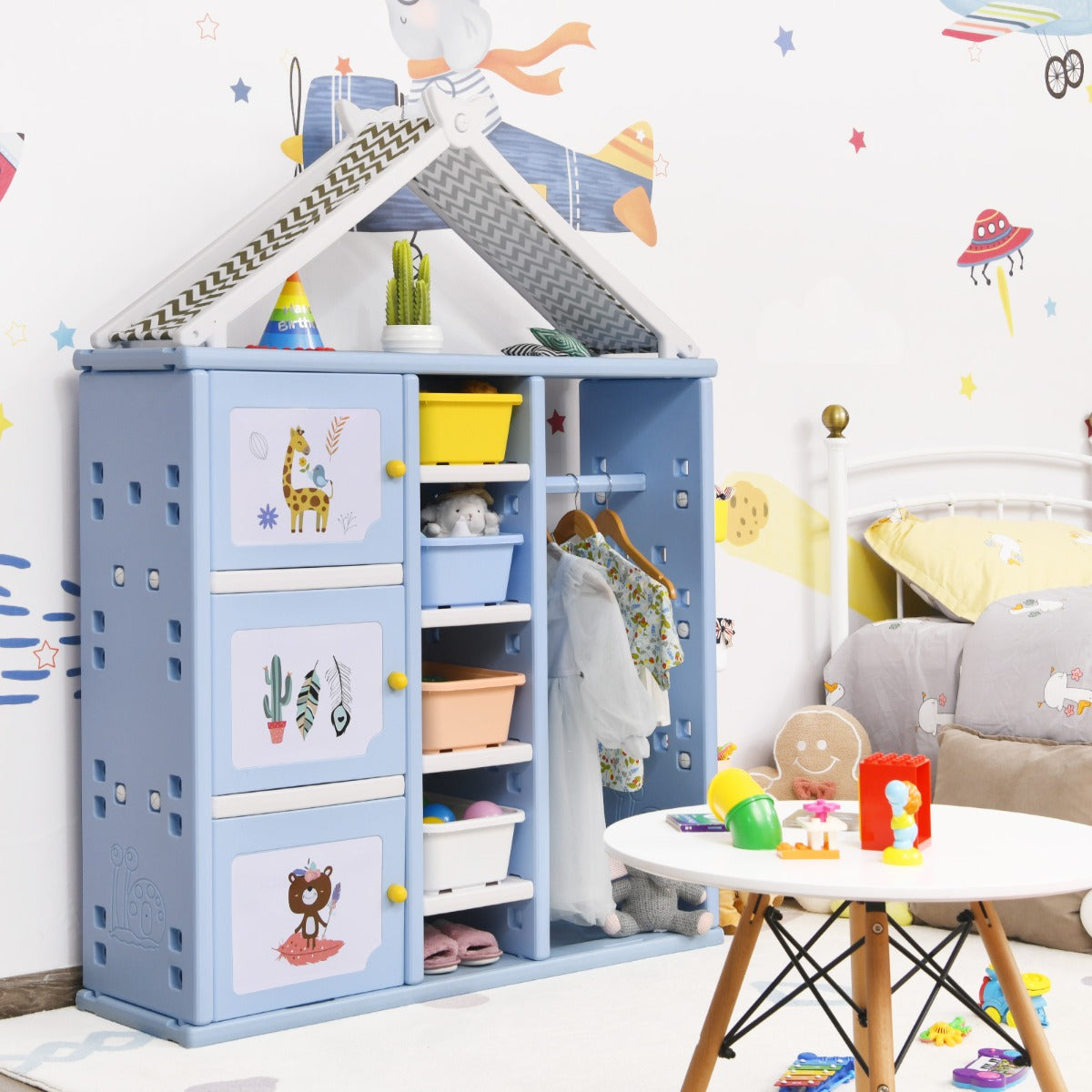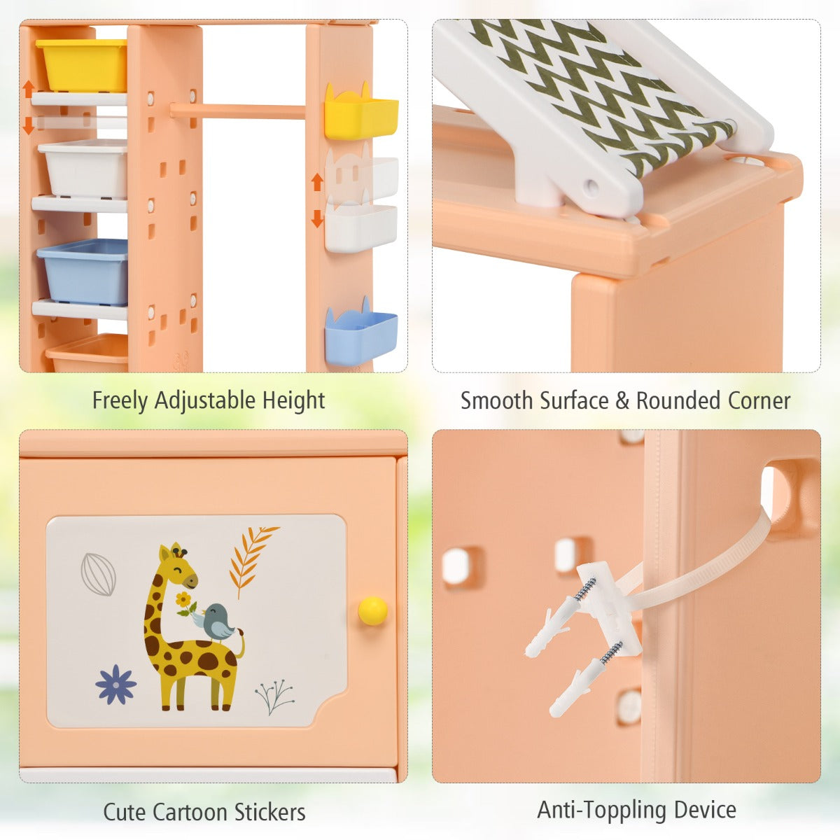 Made of premium HDPE, the whole storage organizer closet is stable and has good weight capacity. Meanwhile, it's safe for kids to use thanks to its anti-toppling device which can attach it to the wall tightly. Besides, its house-like appearance and bright colors add loveliness to your kid's room, making your child fall in love with tidying up.