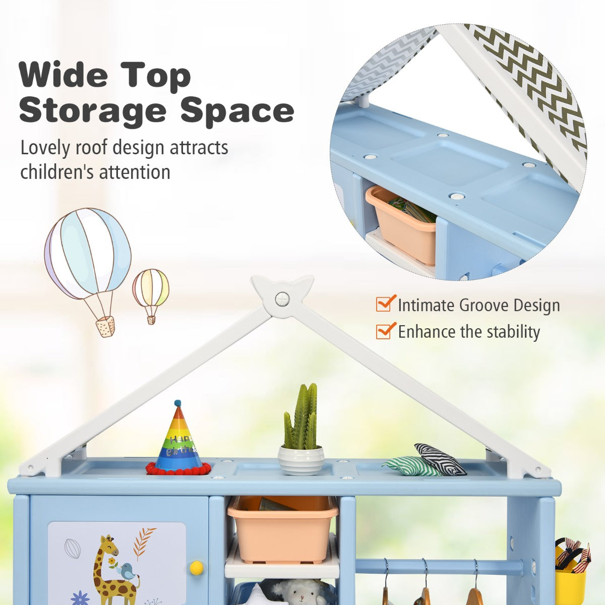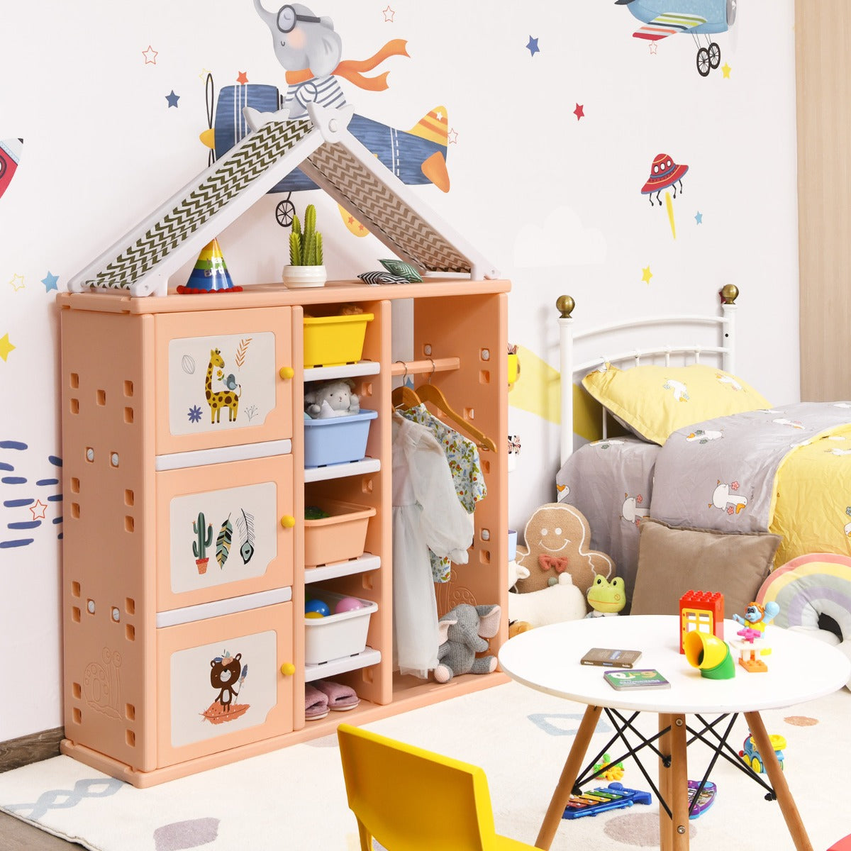 Lovely Appearance & Perfect Gift: With a house-like appearance, this wardrobe brings a touch of warmth and loveliness to your kid's room.Cute stickers are included to decorate the closet. There are3 grooves on the top for kids to decorate the wardrobe in their own style. It will surely be a wonderful present for them.