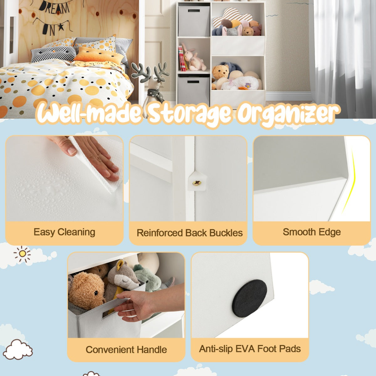 This 5 cubbies cabinet with shelves and anti-slip mats is made from sturdy wooden boards, providing high stability and durability. And the smooth edge and surface have no burr and are easy to clean. Large storage space can accommodate children's books, dolls, toys, photos and other items. What's more, the 2 included fabric bins with convenient handles give additional storage space. They are also easy to fold to a compact size for convenient storage when not in use. With a height designed for kids, this cabinet is convenient for them to categorize, store or take their items. It is a great addition to the bedroom, playroom, classroom, etc., encouraging children to build the habit of tidying up.