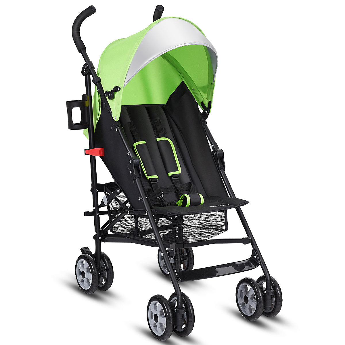 The baby umbrella stroller can be a perfect solution for you to take your child for dining out, shopping, or traveling on vacation. It is a durable and stable stroller with a lightweight aluminum frame and durable oxford cloth. Designed with your baby's comfort in mind, this stroller has a 5-point safety harness with padded straps. In addition, the adjustable canopy with flip out sun visor will help protect your little one's sensitive skin from the sun's harmful rays. 4 recline position will allow your baby to relax in a position that works best for him/her. The storage mesh basket underneath is convenient and handy for holding baby essentials for easy access when you need them. While its fold design make it easy to transport and storage without taking much space. What are you waiting for? Buy one now!