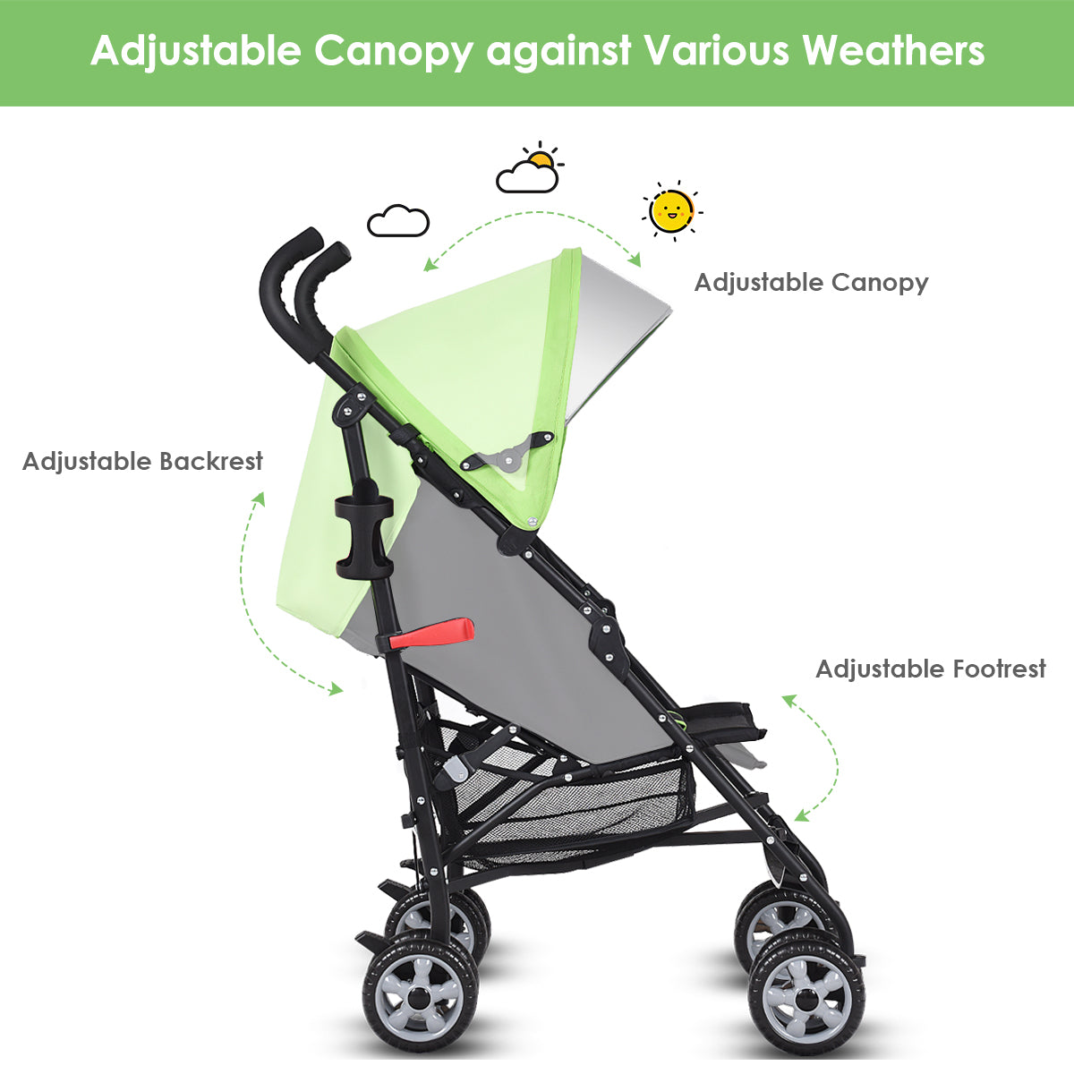 Large Storage and Adjustable Canopy: The mesh basket underneath is considerate and functional, providing large storage space and easy access to baby essentials. The adjustable canopy with pop out sun visor keeps baby shaded and blocks sun and wind.