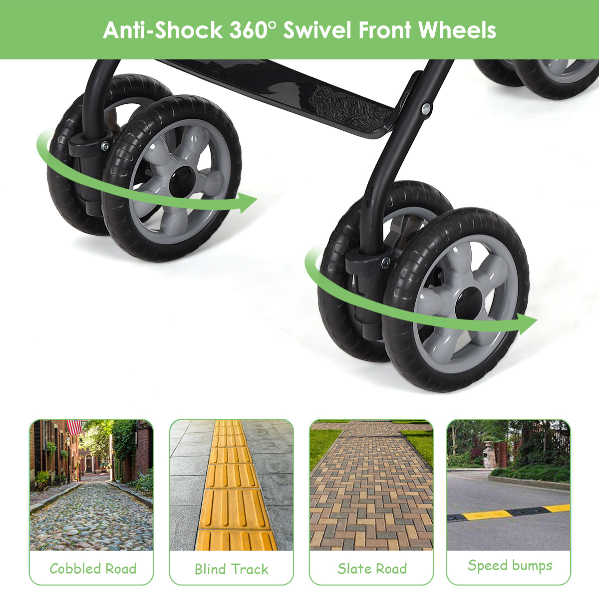 Lockable and 360° Swivel Wheels: The 15 cm front wheel swivels with suspension for maneuverability and can be locked straight to provide stable wheelbase. The rear wheels feature a foot-activated brake system to ensure safe parking, giving you more flexibility.