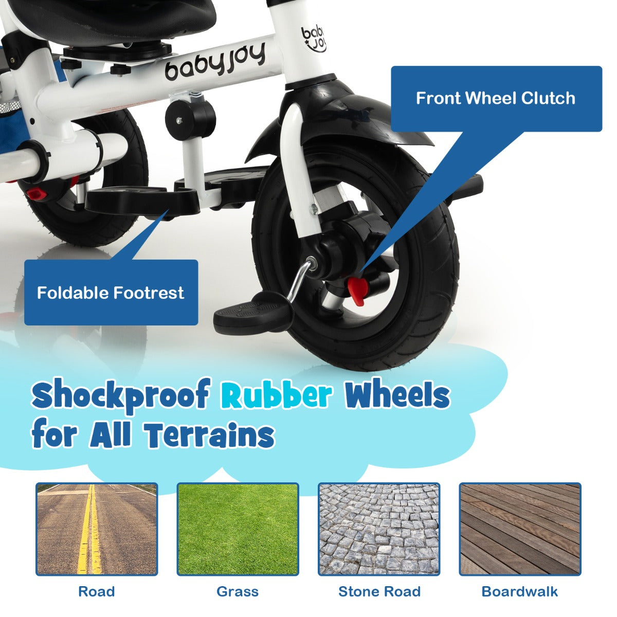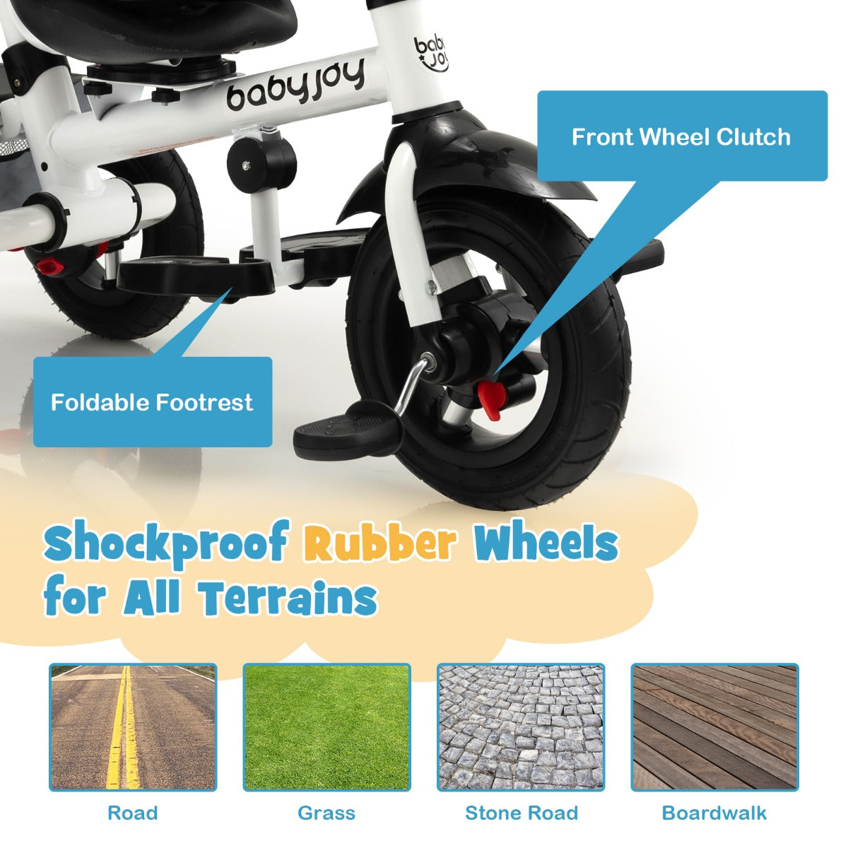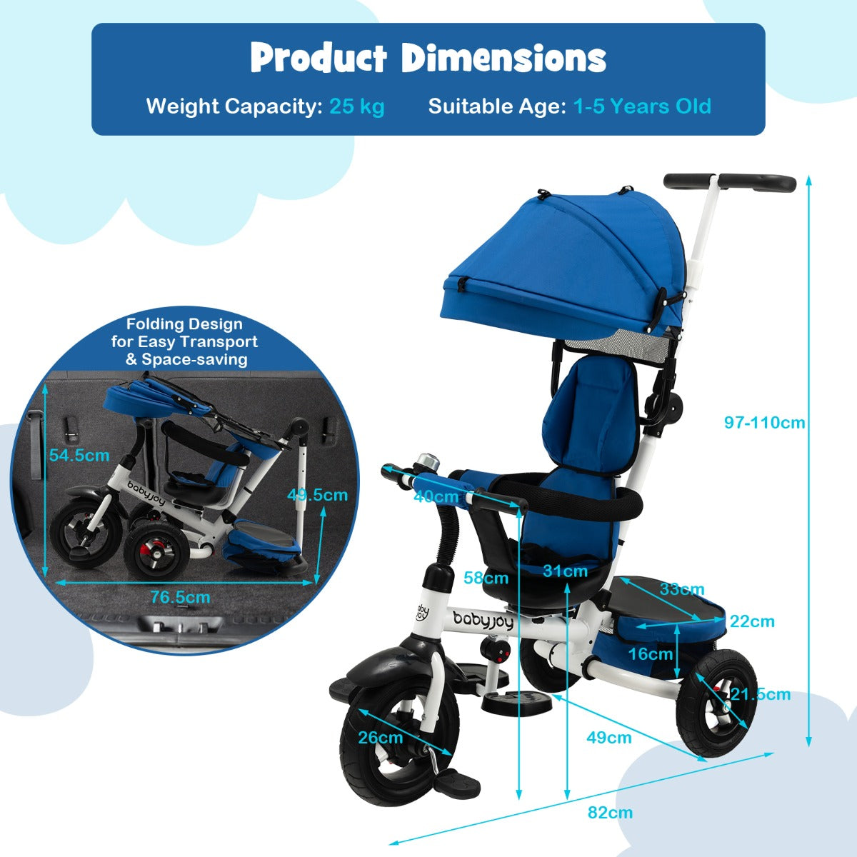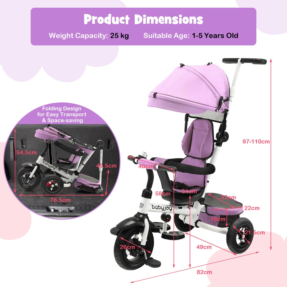 Are you looking for a safe and comfortable tricycle for your little boy or girl? This folding baby tricycle is exactly what you want! The versatile stroller tricycle with various adjustable positions is suitable for kids from 12 to 60 months and can accompany your kid for years to come. The canopy, footrest and push rod all can be adjusted for more comfort. And you can fully control the direction of the tricycle with the steerable push rod. Besides, the safety belt, double rear brake and guardrail ensure the safety and security of kids. With the premium rubber wheels, you can hang out with your baby in varied terrains. And the large rear basket offers great convenience. Plus, the baby tricycle is foldable, which takes up less space when not in use.