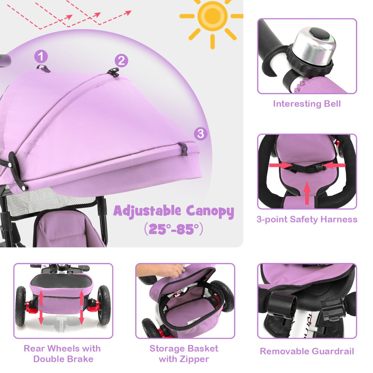 Convenient Design: The adjustable canopy provides excellent sun protection, and can be easily folded down to save space. In addition, the storage basket on the back of the tricycle allows you to take everything the baby needs with you.