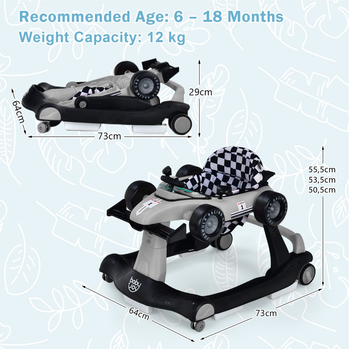 Interactive Design: Boasting a steering wheel, shifter, 2 light buttons with different lights and 2 rearview toy mirrors, this baby walker simulates the appearance of a racing car, satisfying your little one's curiosity for exploring and early learning. And the music makes the fun even longer. Requires 2 AA batteries (not included).