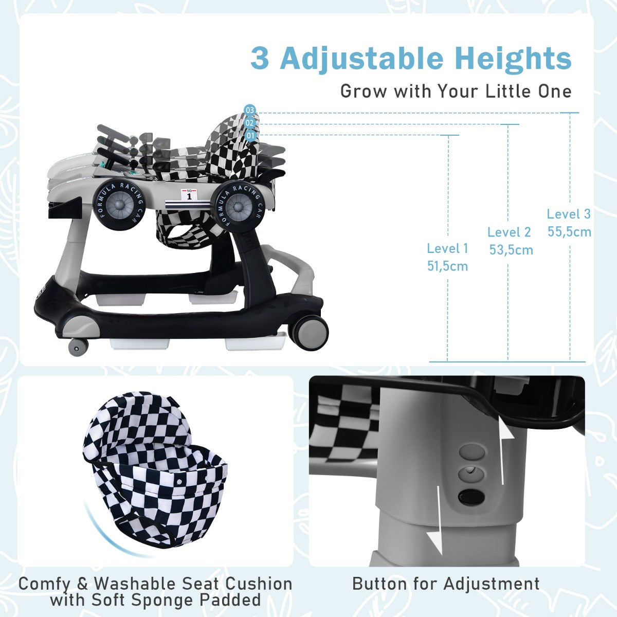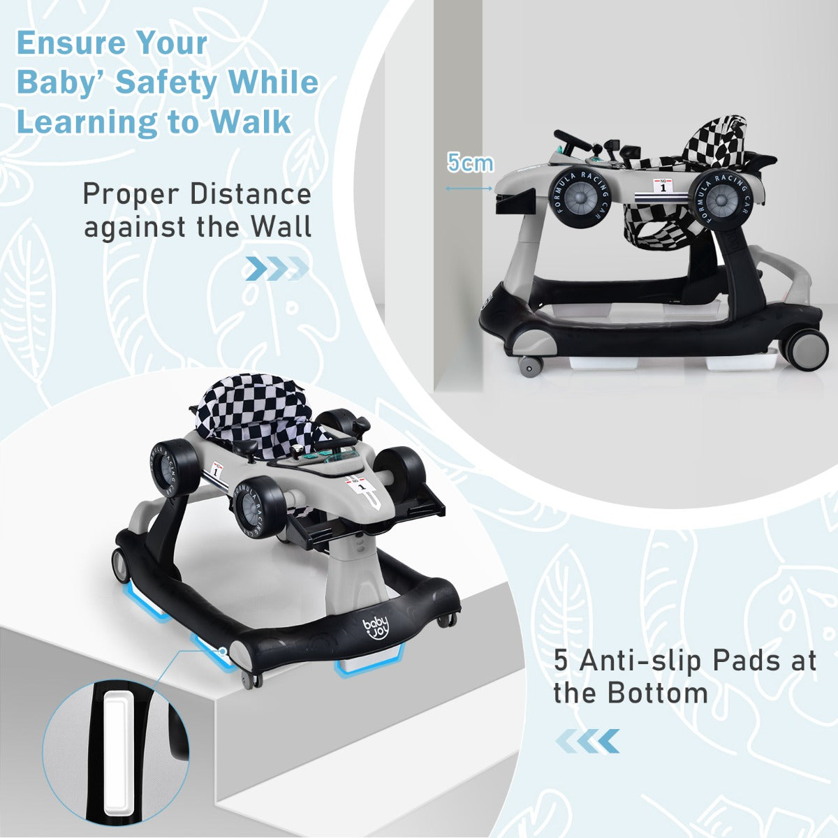 Including activity walker mode, baby push-behind mode, push car mode and rolling toy car mode, this activity walker with adjustable height and speed accompanies your little one's growth while satisfying various needs. Furthermore, safety is also important. Therefore, the safety bumper, anti-slip stair pads and wheels keep your baby's safe. Meanwhile, the comfortable and washable seat cushion is padded with soft sponge and designed with ergonomic backrest, which provides cozy sitting experience. Additionally, the music box with light greatly attracts your little one's attention. After using it, you can fold this activity walker to save your home space.