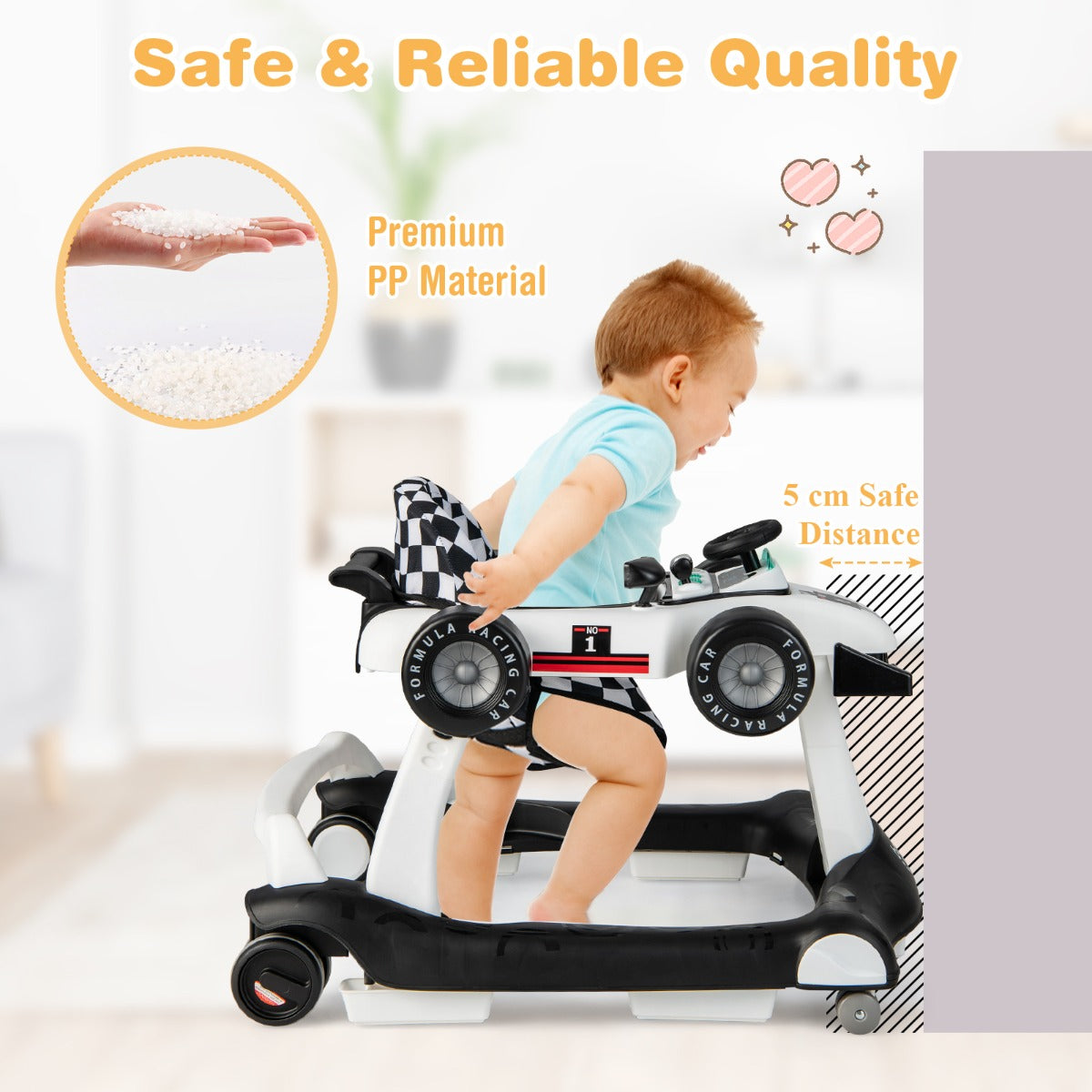 Adjustable Height and Speed: In order to grow with your little one, this multipurpose baby walker comes with 3 adjustable heights so that you are able to adjust it according to your baby's changing height. Besides, the speed of 2 rear wheels can be adjusted based on your little one's strength.