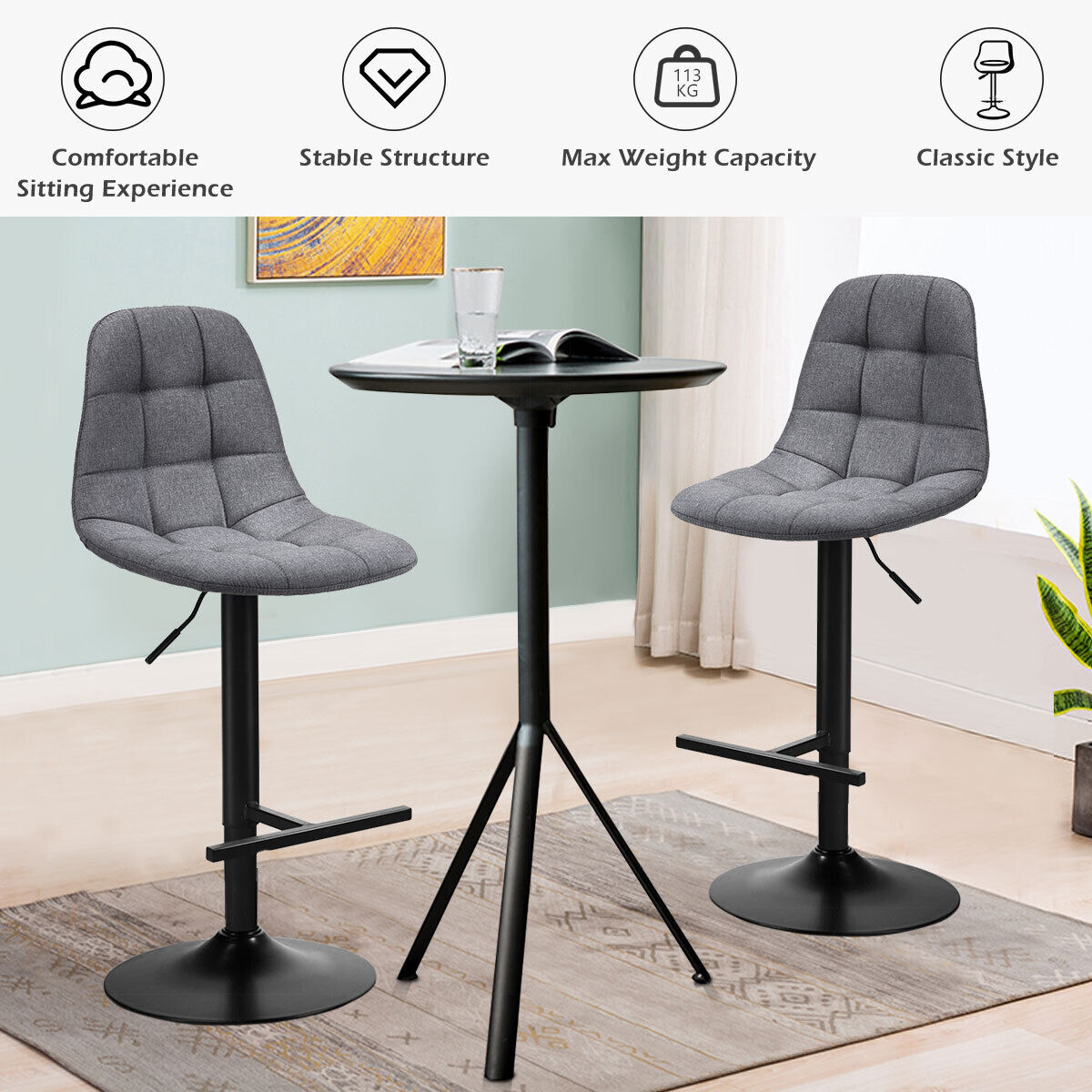 360 Degrees Swivel Seat: We provide these 2 bar chairs with comfortable seats. It allows you to enjoy your leisure time with your friends. The seat can rotate 360 degrees and you can sit on it and let it rotate freely to relax your mood. It will create a relaxing atmosphere for you and add to your life's pleasure.