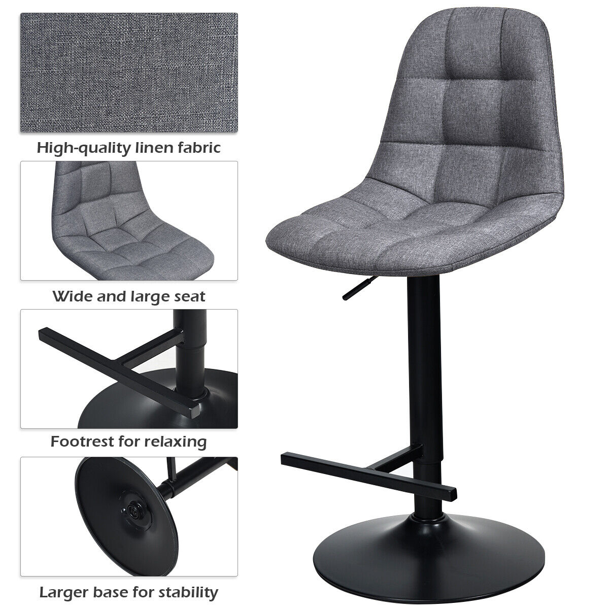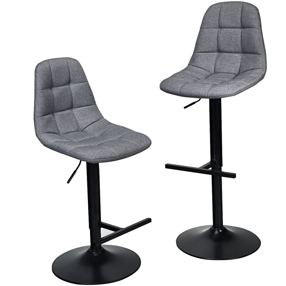 Our 2-pcs bar stool will fill your life with joy and texture. The unique linen seat, looks concise, increasing the artistic beauty in your life. Meanwhile, the elegant and fluent line that fit better on your body, and the cushion padded with a soft sponge will make your sitting more enjoyable. Height-adjustable gas rods could provide you with an ideal seat height. The T-shaped footrest gives you a comfortable place to rest your feet. Wide and large chair seat that allows you to sit on it and rotate freely, keeping your leisure time away from boredom. It can be used in kitchens, restaurants, pubs, cafes, terraces, gardens, backyards, etc.