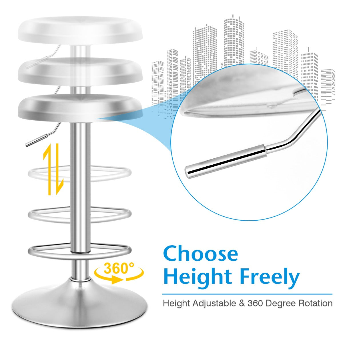 Adjustable Swivel Bar Stool: Equipped with a level one pneumatic rod, our bar stool has a height range from 61cm - 82cm. You could adjust it to the most comfortable height to match different tables by lifting the lever under the seat. The 360-degree swivel seat allows you to rotate freely to be convenient for your daily life and work.
