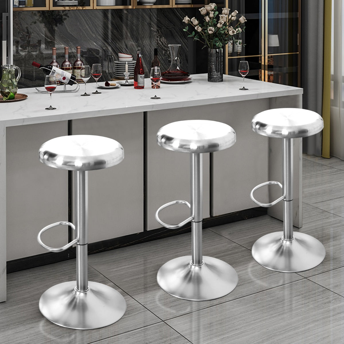 Our stainless steel swivel bar stool has round seat and comfortable footrest. The chair surface is smooth, waterproof and corrosion-resistant. Compared with PU leather seats or fabric seats, the stainless steel seat takes less time to maintain and lasts for a longer time. With height and an adjustable pneumatic system, the bar stool can match different tables. And you can rotate freely to talk with your friends. Put your feet on the comfortable footrest to have a better sitting experience. The round counter chair provides you with more stability with a large heavy base. And non-marking pads can protect your floor from scratches. You can put it in the kitchen, living room, bar, cafe, restaurant, recipient, etc. Get one or more stools to decorate and convenient your life.