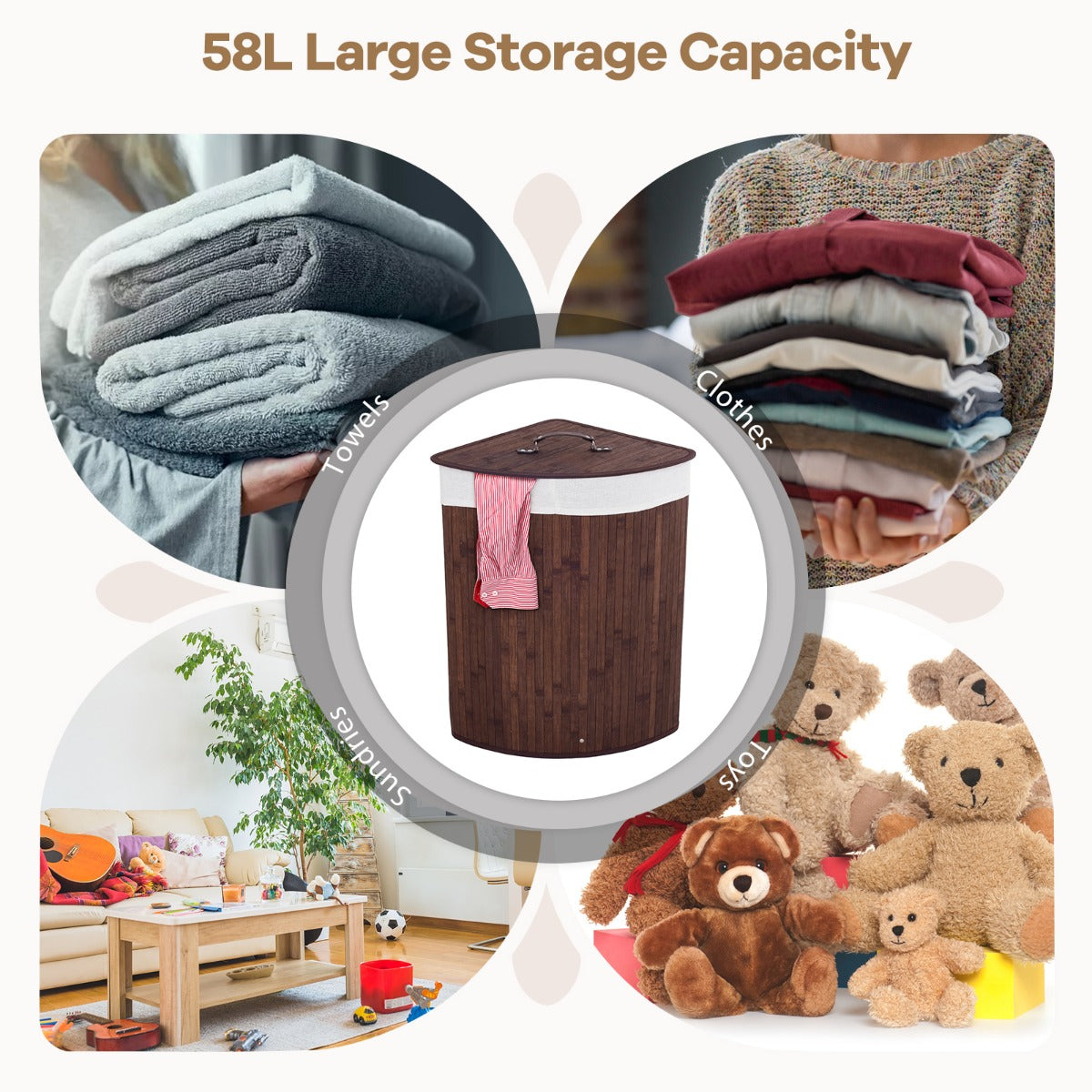 Keep your laundry area neat and clean with our bamboo corner laundry hamper! This laundry hamper features a lid to keep dirty clothes out of sight and a removable liner bag to transport dirty clothes to the washing machine easily....View More
