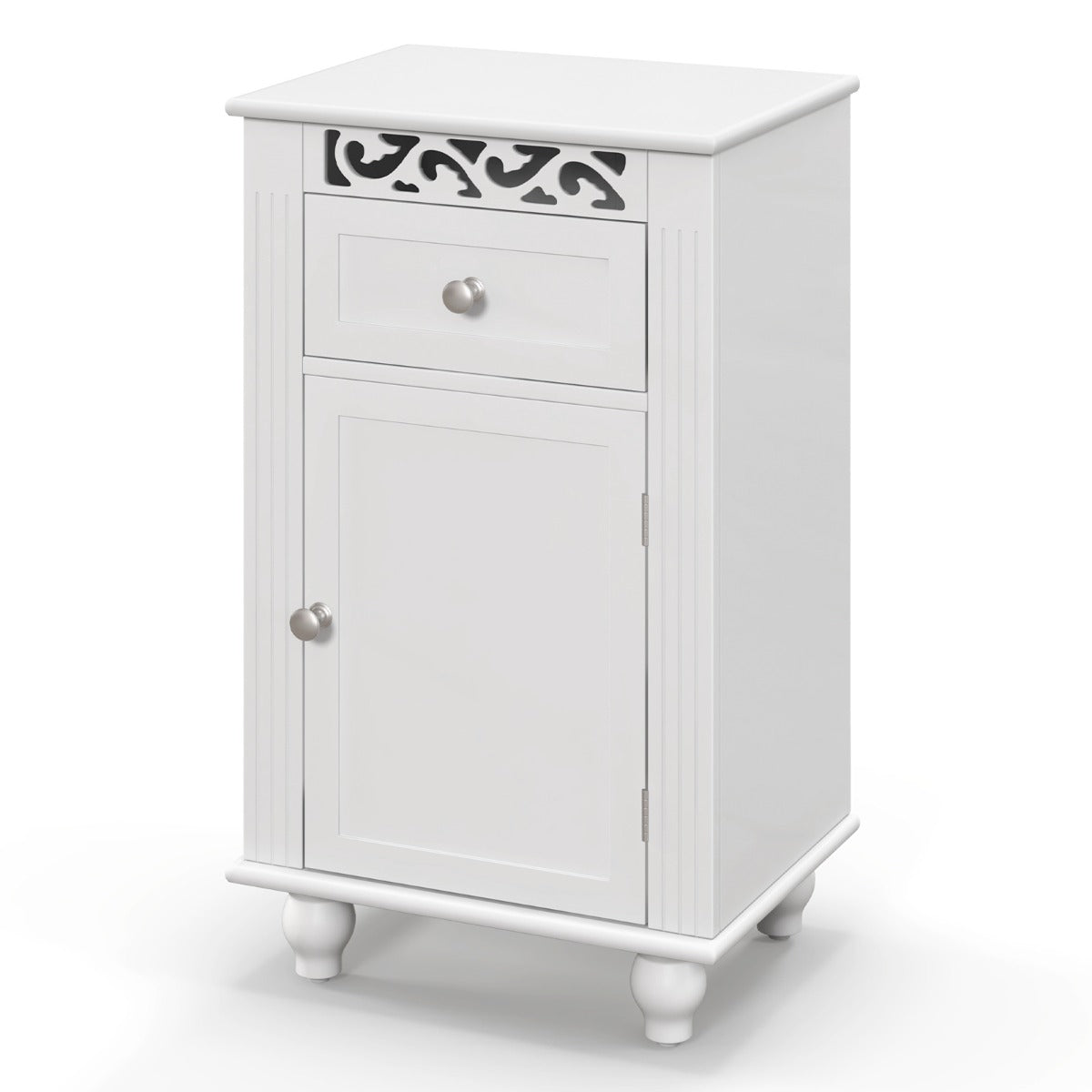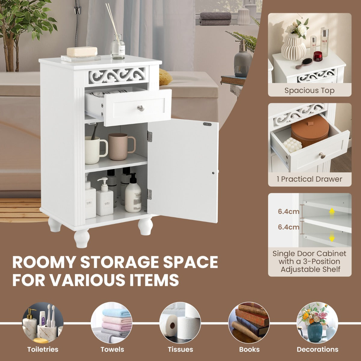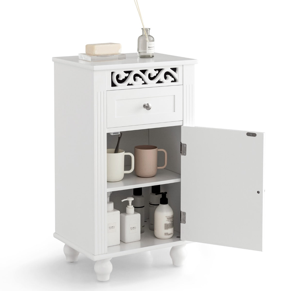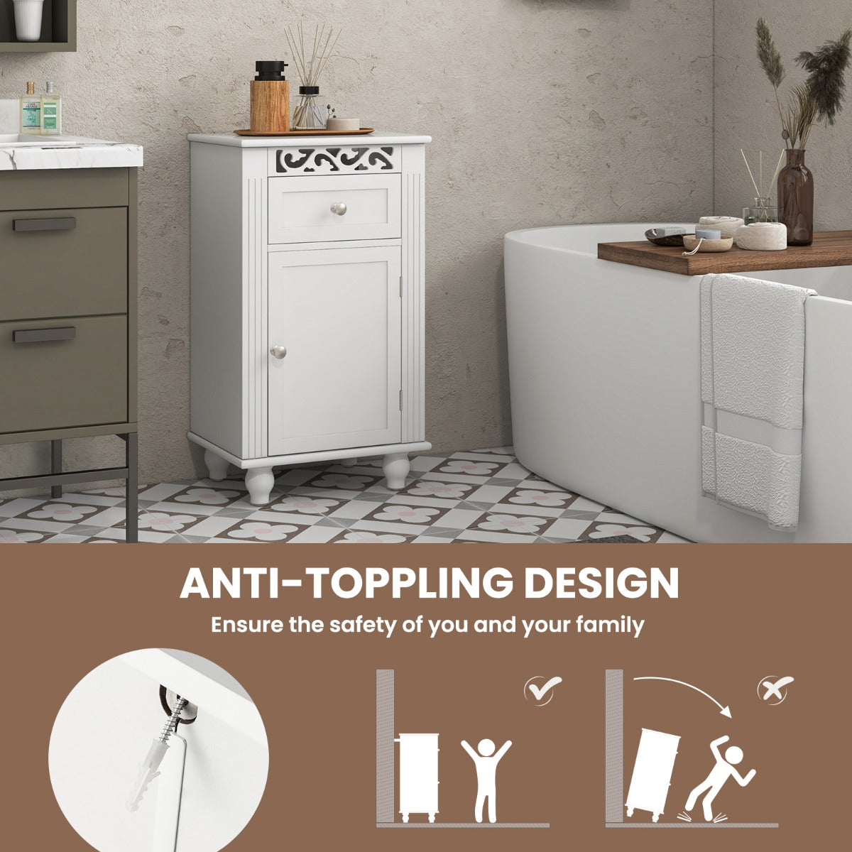 Equipped with a pull-out drawer and a single door 2-tier cabinet, this freestanding storage organizer provides roomy storage space and is a good choice for tucking away bathroom clutter. Besides, there is a 3-position adjustable shelf to store items of different sizes. Made of premium MDF and solid wood legs, this bathroom floor cabinet is stable and durable. Moreover, the anti-toppling device helps to fix the cabinet to the wall firmly for added safety. The pure white finish, clean lines and unique carved flower pattern make this floor storage cabinet look elegant and fit well with any home decor.