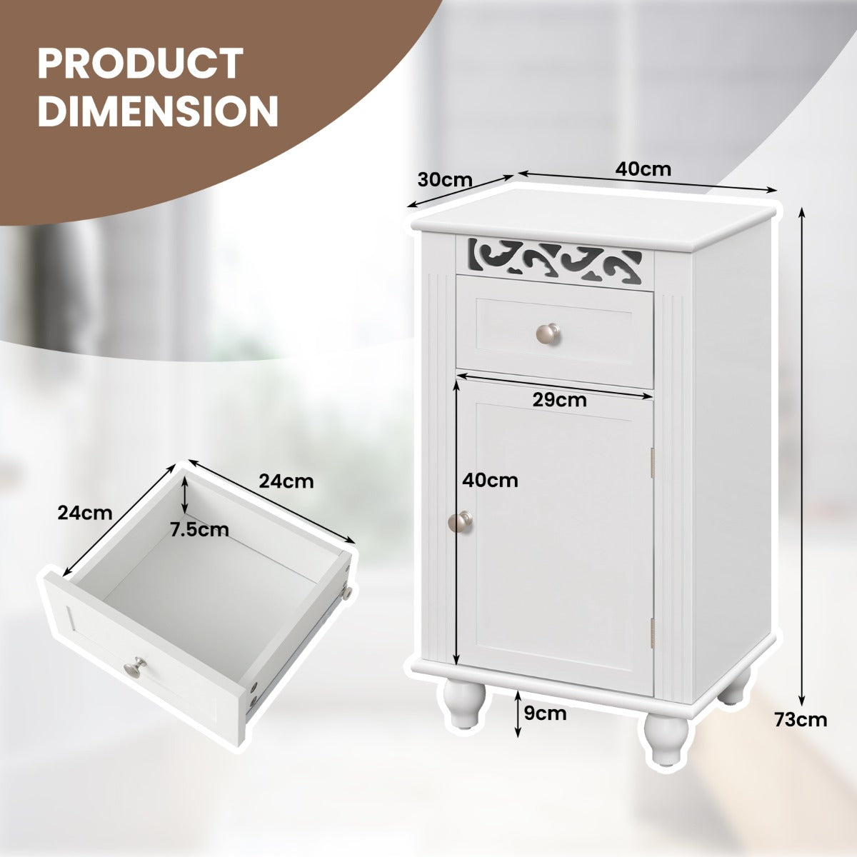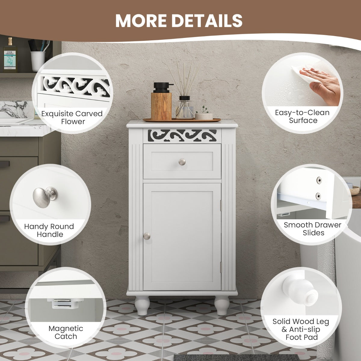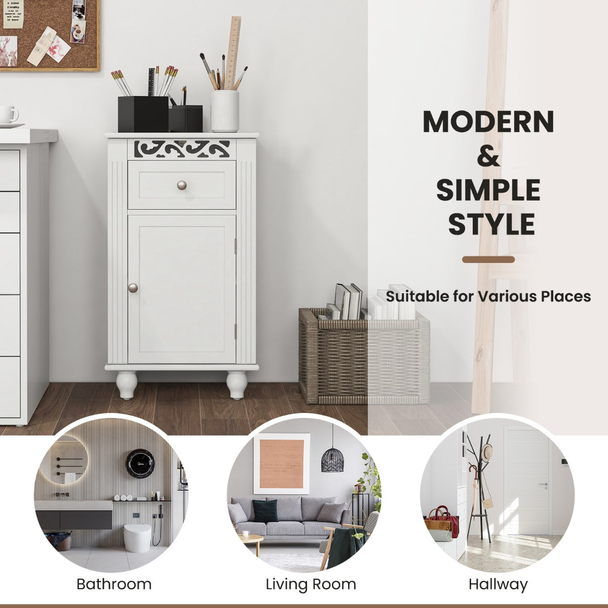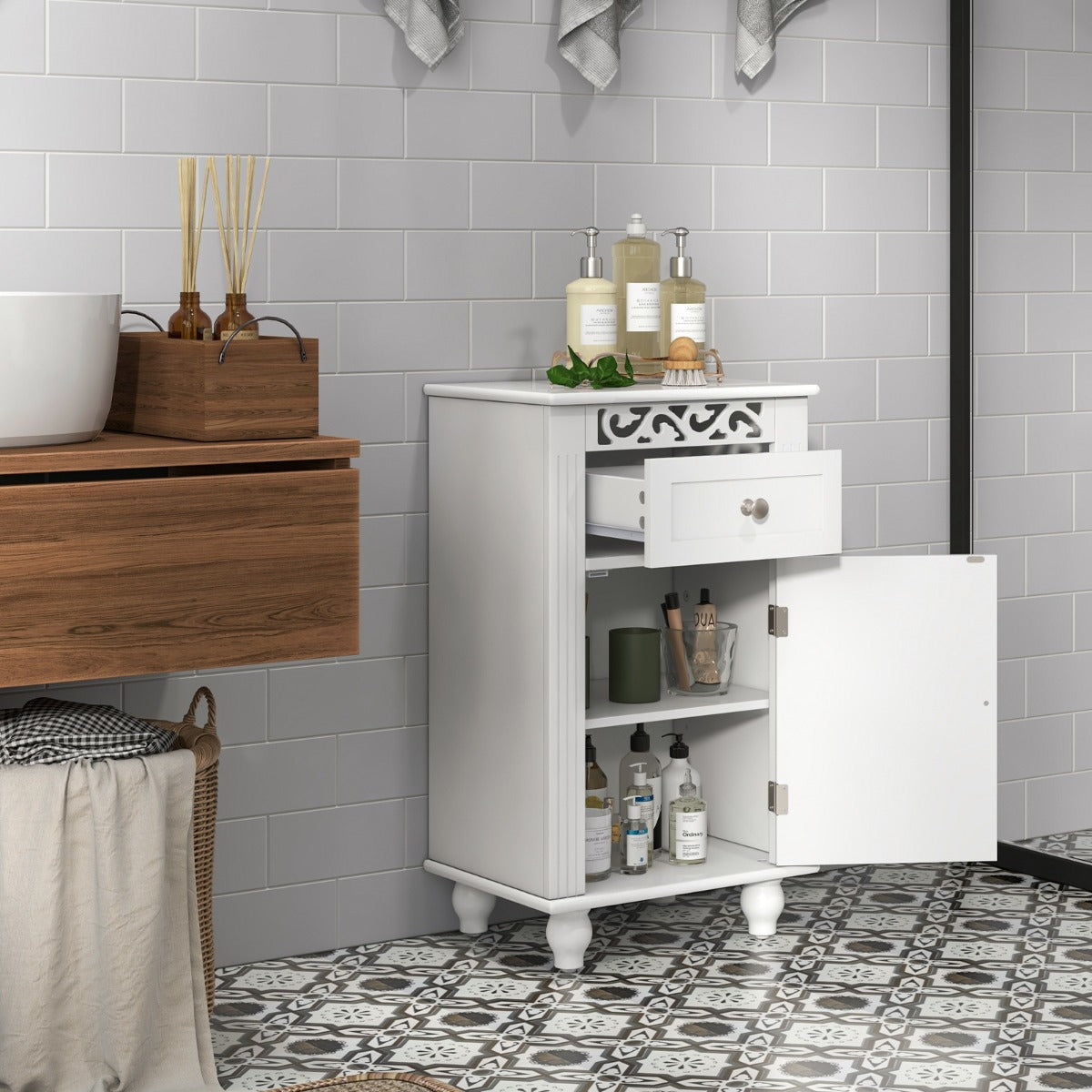 Equipped with a pull-out drawer and a single door 2-tier cabinet, this freestanding storage organizer provides roomy storage space and is a good choice for tucking away bathroom clutter. Besides, there is a 3-position adjustable shelf to store items of different sizes. Made of premium MDF and solid wood legs, this bathroom floor cabinet is stable and durable. Moreover, the anti-toppling device helps to fix the cabinet to the wall firmly for added safety. The pure white finish, clean lines and unique carved flower pattern make this floor storage cabinet look elegant and fit well with any home decor.