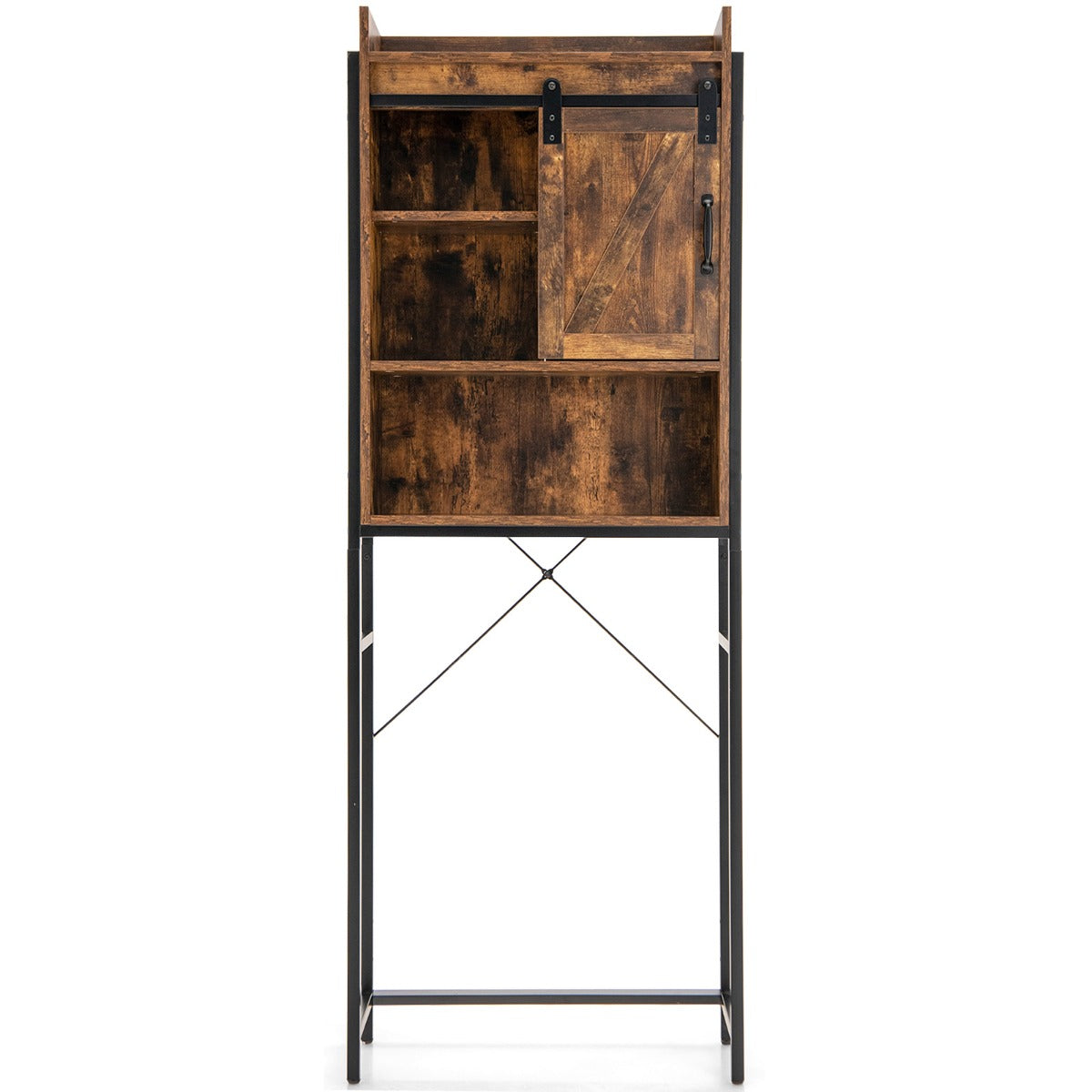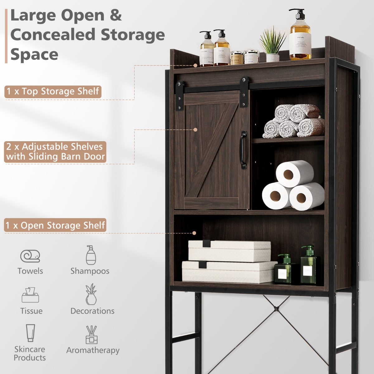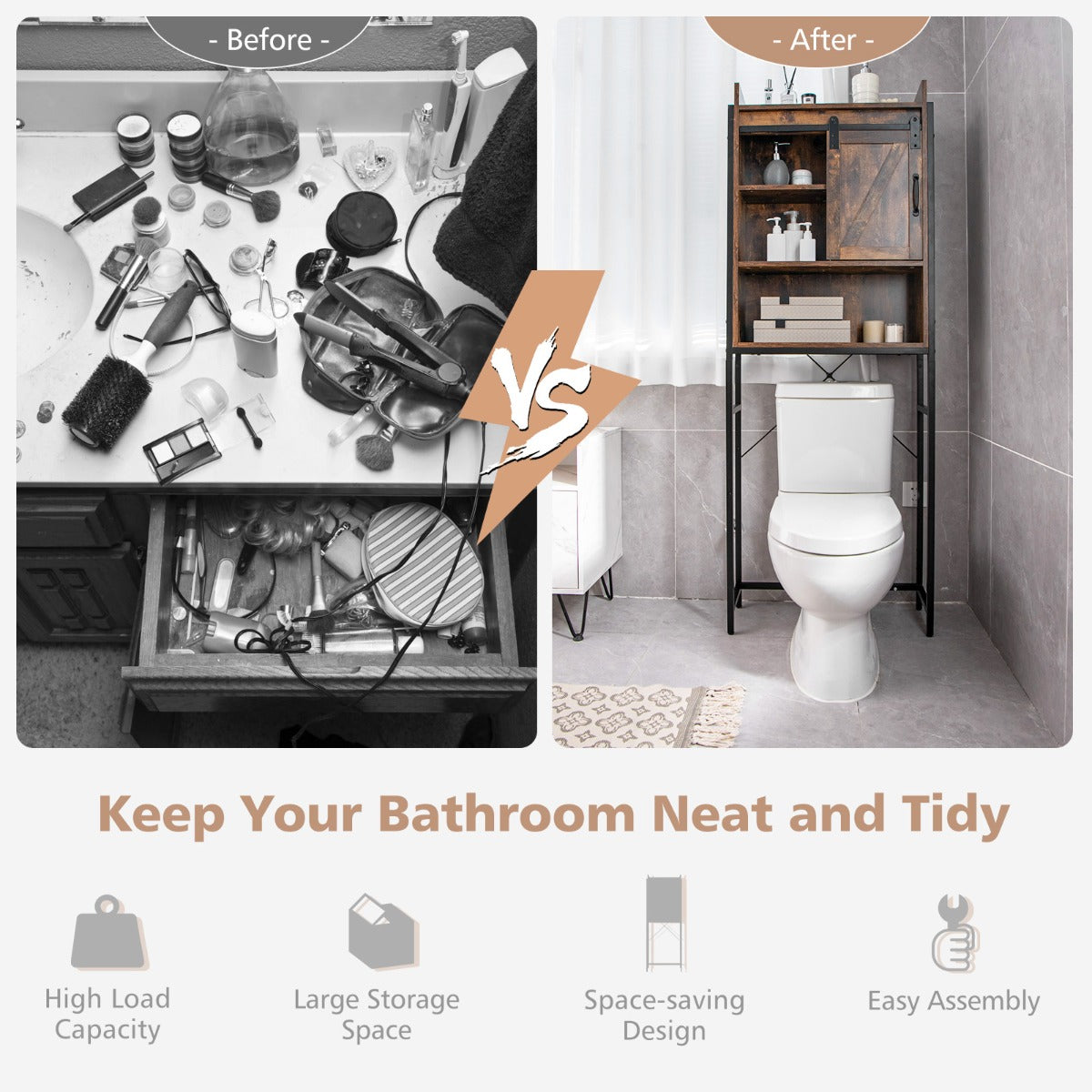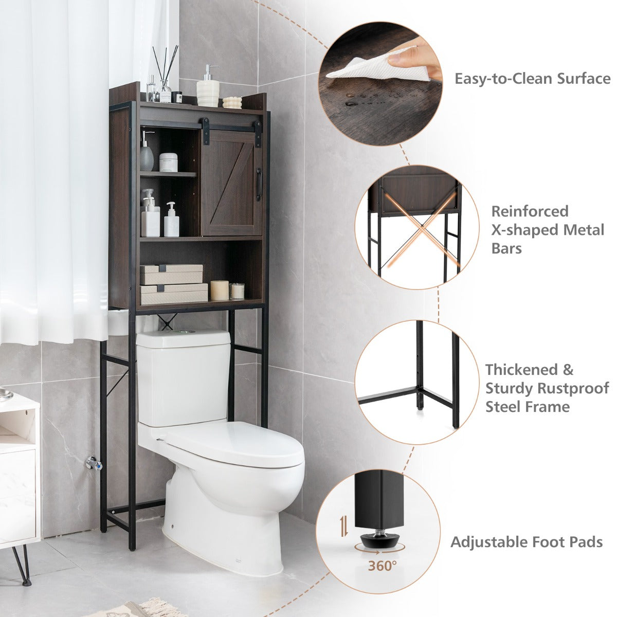 Our freestanding toilet storage cabinet will be a great helper for storage in small places. This bathroom space saver maximizes the wall space without eating up the floor area and offers 4-tier storage shelves for towels, toilet paper and more. And the adjustable shelf allows you to well organize supplies of different heights. The sliding barn door design not only adds more glamour to your space but is also handy to take and put items. The sturdy steel frame and premium engineered wood material offer long-lasting service. Also, the over-the-toilet storage cabinet is equipped with an anti-toppling device for more safety. And the adjustable foot pads keep the cabinet level on uneven floors. The assembly is easy and quick with the instructions.