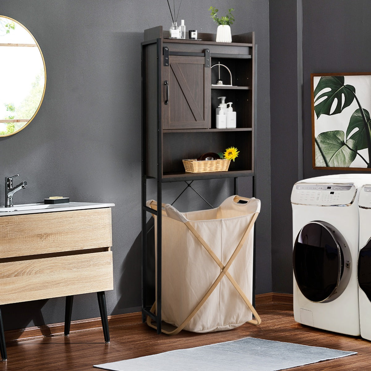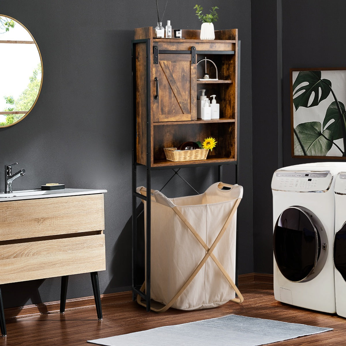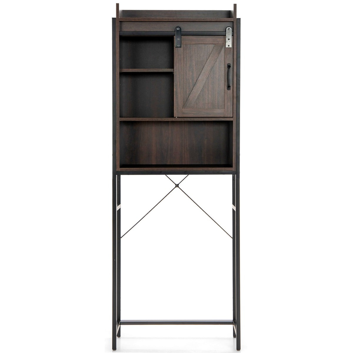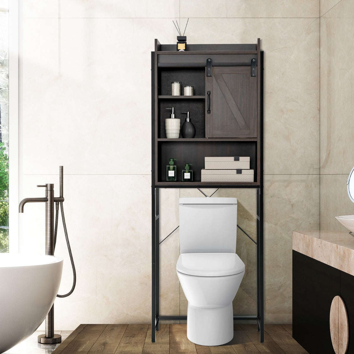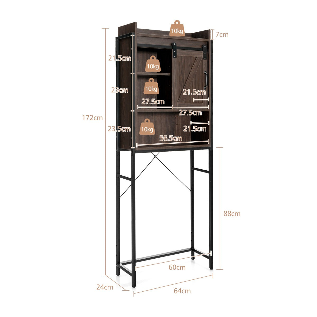 Our freestanding toilet storage cabinet will be a great helper for storage in small places. This bathroom space saver maximizes the wall space without eating up the floor area and offers 4-tier storage shelves for towels, toilet paper and more. And the adjustable shelf allows you to well organize supplies of different heights. The sliding barn door design not only adds more glamour to your space but is also handy to take and put items. The sturdy steel frame and premium engineered wood material offer long-lasting service. Also, the over-the-toilet storage cabinet is equipped with an anti-toppling device for more safety. And the adjustable foot pads keep the cabinet level on uneven floors. The assembly is easy and quick with the instructions.