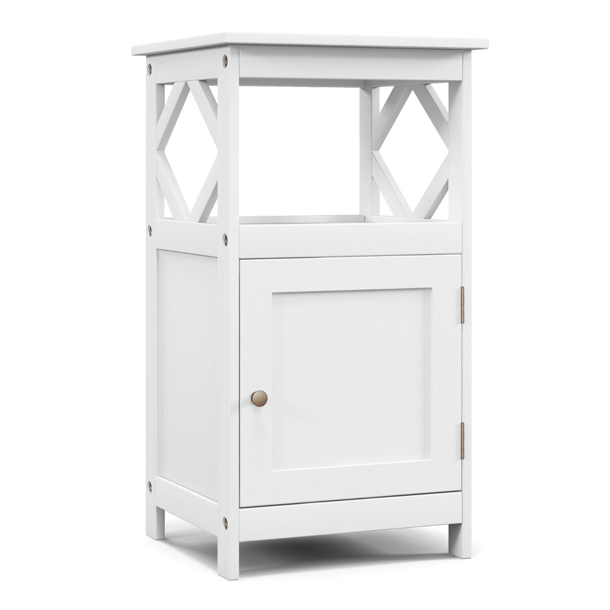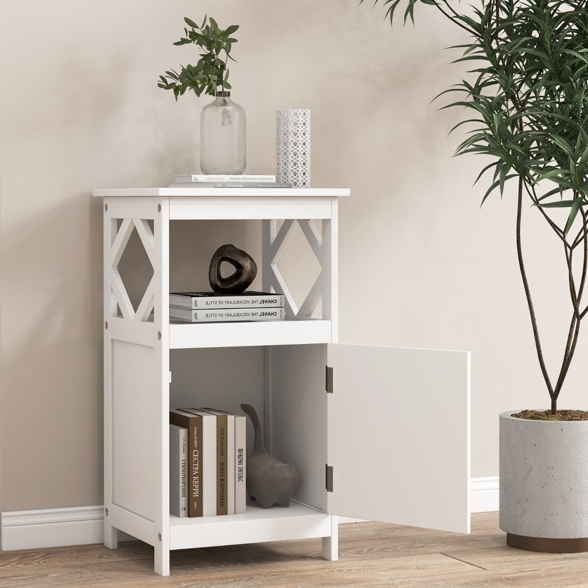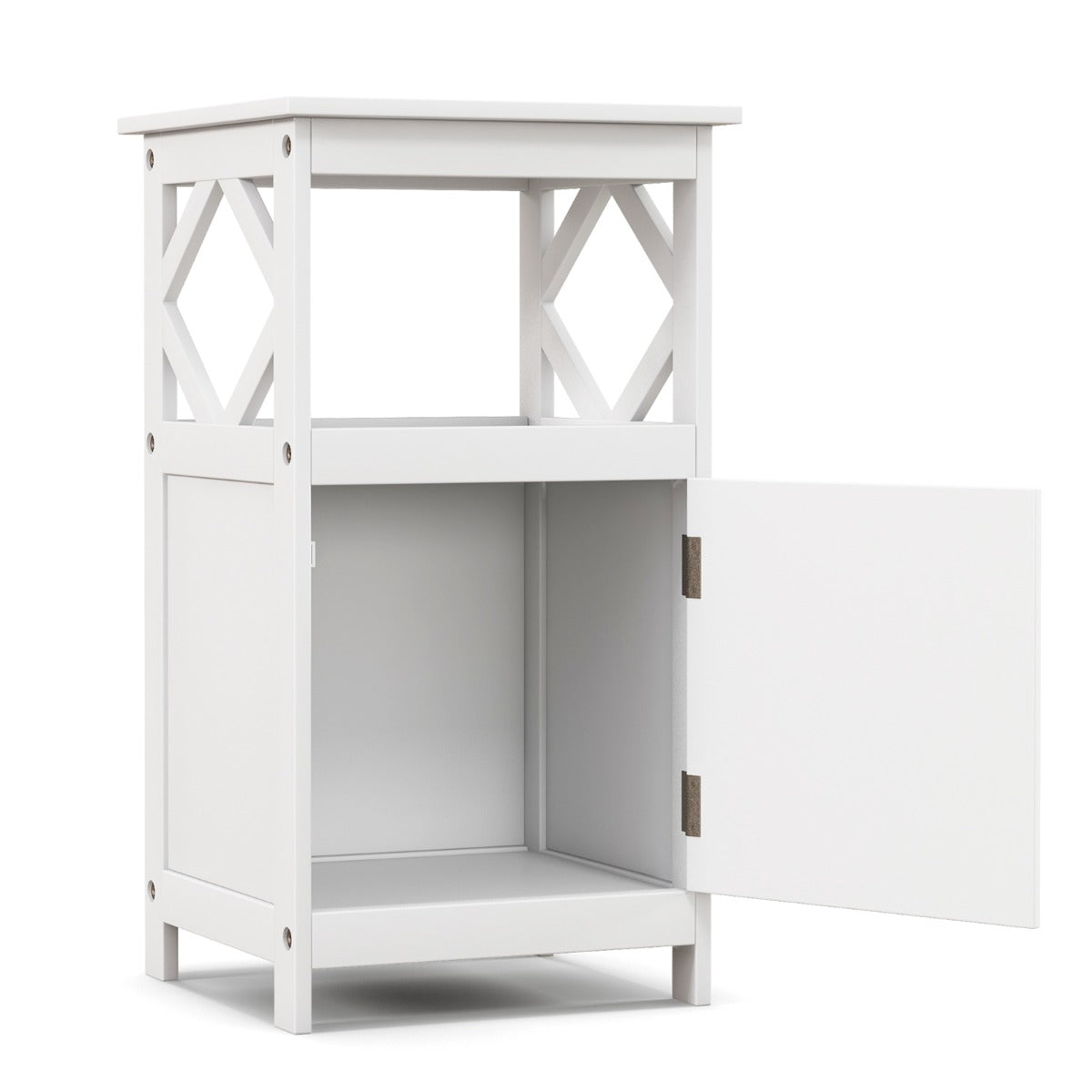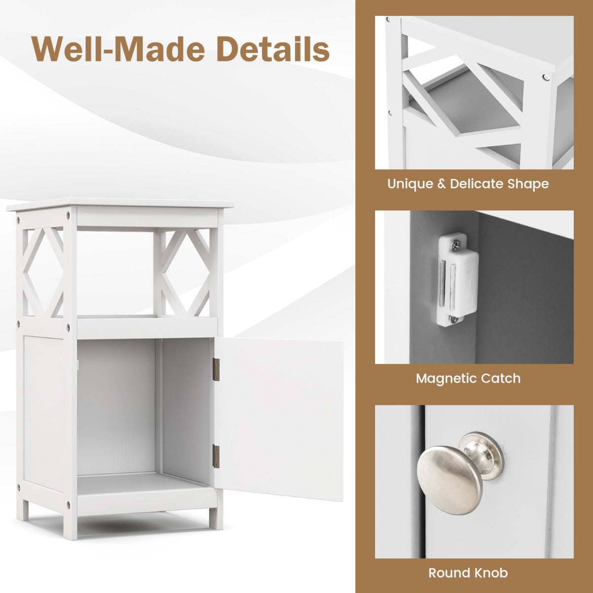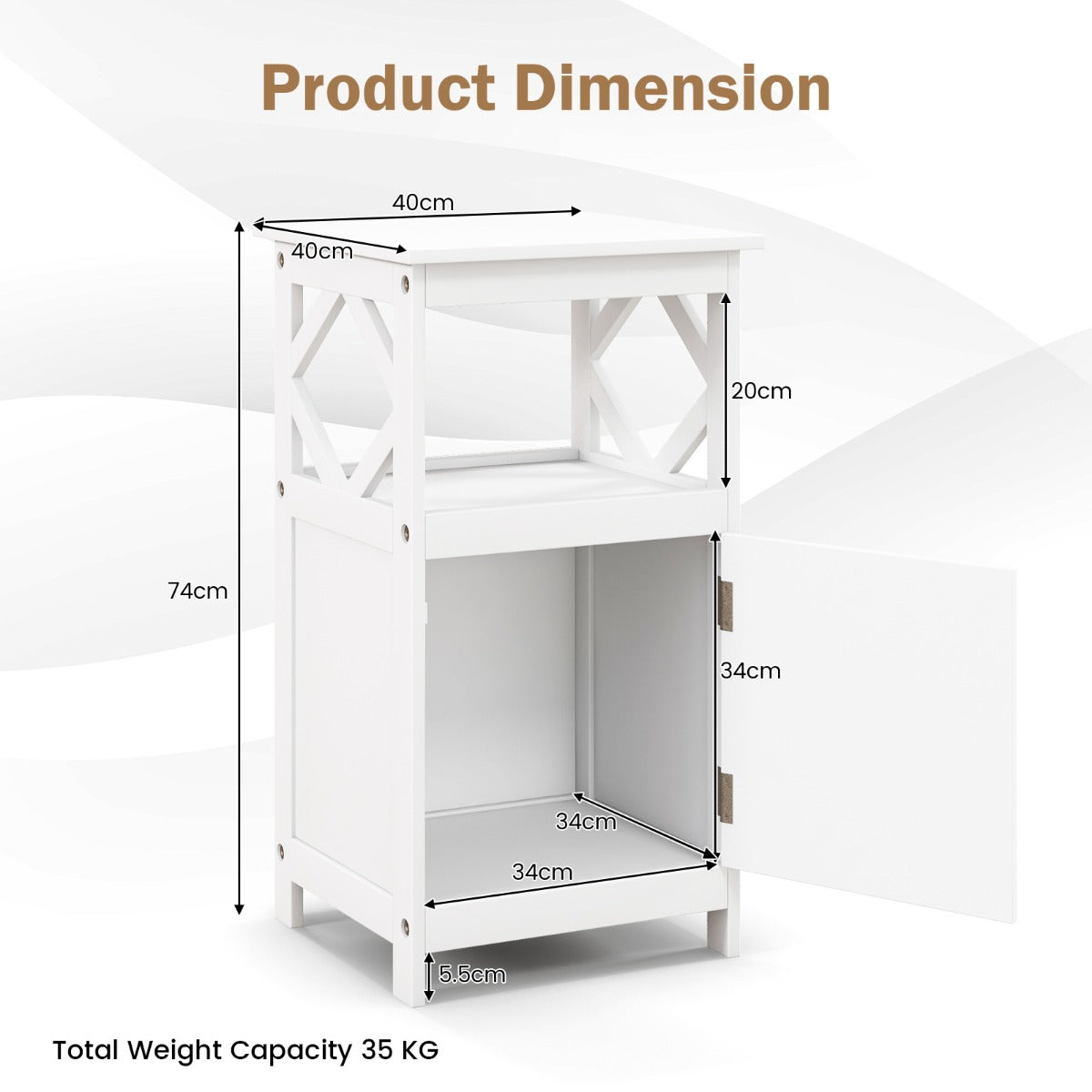 Perfect Organizer for Your Bathroom! Our single-door bathroom floor cabinet measures 39.37 x 39.37 x 73.66 cm (L x W x H) and comes with a door cabinet and 2 tiers of open shelves, providing enough space to well organize your items, such as shampoos, towels, toiletries, papers, decorations, books, etc. Moreover, it is equipped with an anti-toppling device that can fix the cabinet on the wall, enhancing stability and safety. Whether in the bathroom, living room, bedroom, or entryway, our storage cabinet can satisfy your storage needs while not taking up much floor space, keeping your room tidy. And the side storage cabinet with an elegant white appearance combines modern charm with a minimalist design that can blend into any home decor easily!