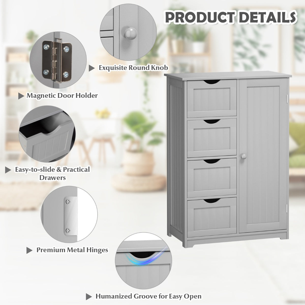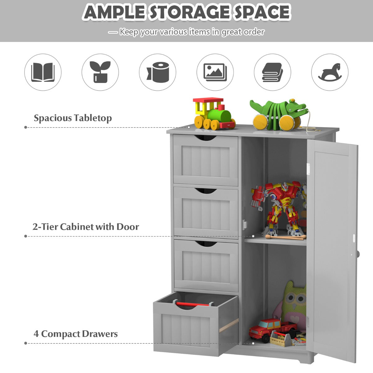 Ample Storage Space and Adjustable Shelf: Equipped with 4 drawers and 1 single-door cupboard, this floor storage cabinet provides ample space to store and organize your daily items like towels, tissues, books or other decorative items. Besides, the inner shelf can be adjusted to 3 positions to accommodate items with different heights.