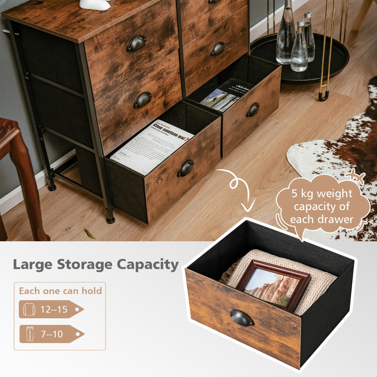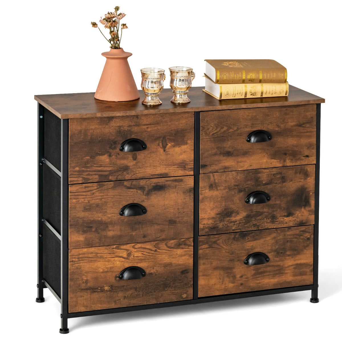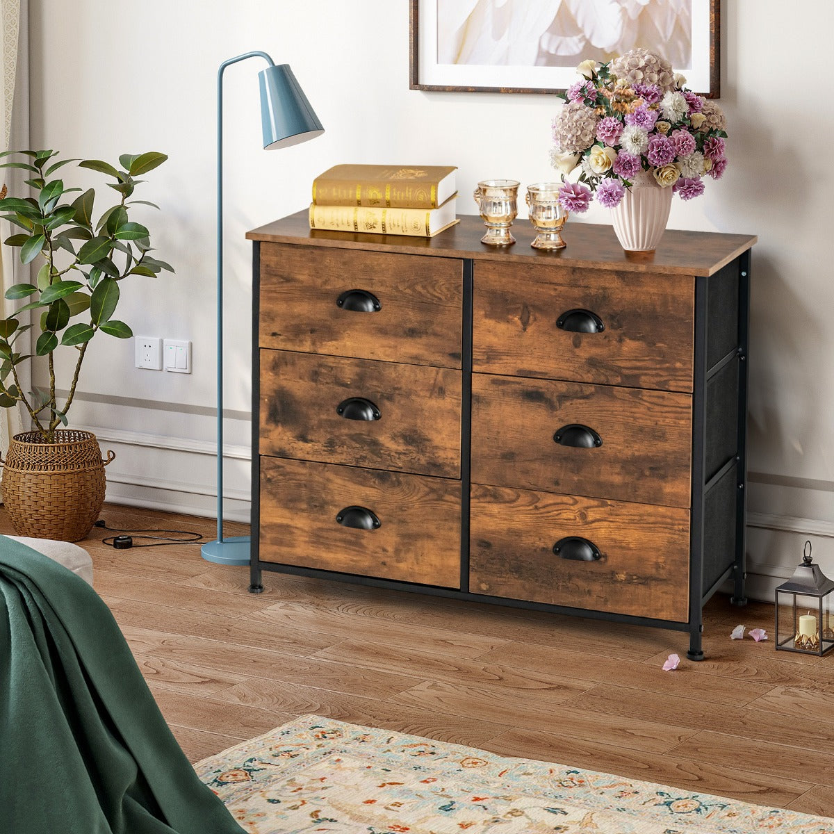 Featuring 6 fabric drawers and a spacious tabletop, this 3-tier dresser offers roomy storage space for your clothes and other home supplies. The drawers are equipped with metal handles for smooth opening and closing. The steel frame with X-shaped bars enjoys better stability. Also, the steel frame is built with powder coating to increase rust resistance for long time use. Besides, you can fix the dresser to the wall if needed and the anti-toppling device is included in the package. The non-woven fabric drawer is built with an MDF top to present a good-looking match with its rustic style. The assembly is easy with instructions and foldable drawers. This 6-drawer dresser is perfect for the living room, bedroom, hallway, entryway and more.