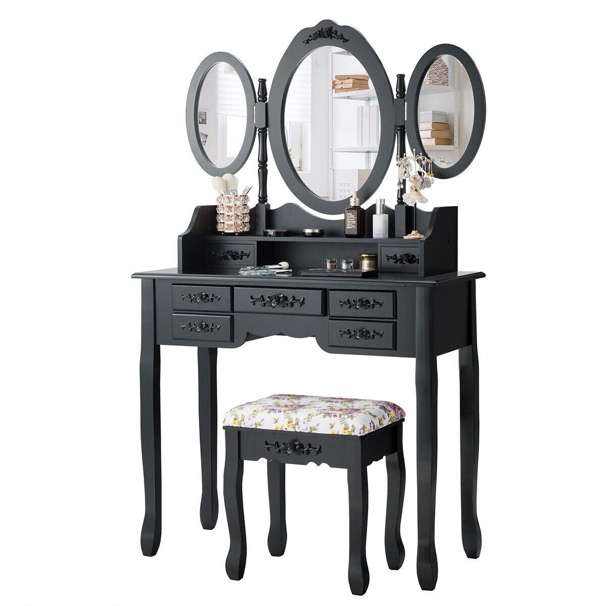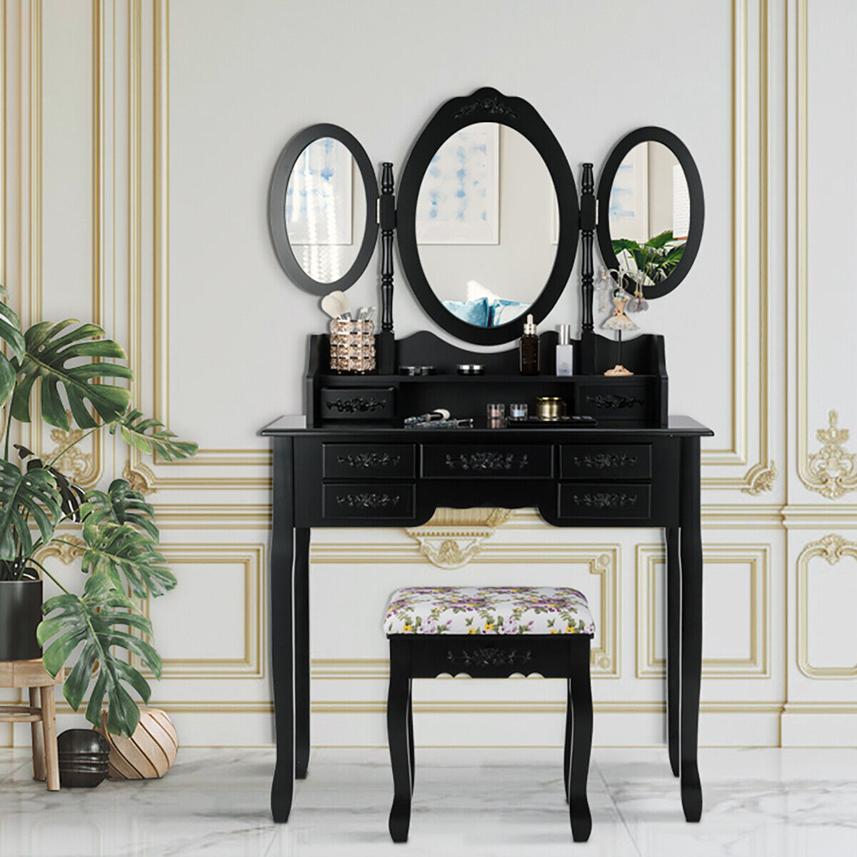 An elegant and practical vanity set can help you to put on beautiful make-up. Our vanity set will never let you down with its charming appearance as well as its powerful practicality. Made of the thick-density board and solid wood, this dressing furniture set is sturdy and durable enough to serve you for a long time. 3 mirrors can be folded or rotated to get better light when you are making up. Featuring 7 drawers with exquisite knobs, you can store your jewellery and ornaments in order. And the spacious tabletop also has enough space for storing your Cosmetic and make-up tools. Designed in an elegant and gorgeous style, the whole set will be a perfect décor for your home. Give yourself or a loved one this vanity set as a considerate gift.