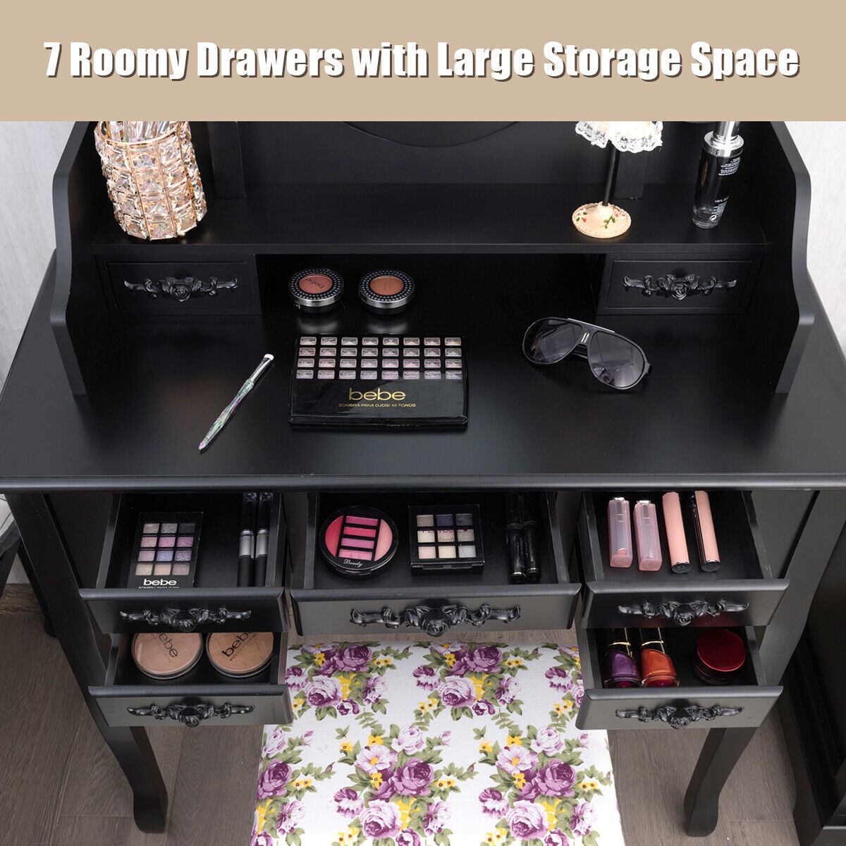 Adequate Storage Space: There are 7 wide drawers and a spacious shelf on the table, which undoubtedly provides you with much storage space to sort your cosmetics and jewelry. Plus, when you are not using the stool, you can also place it underneath the table to save space.