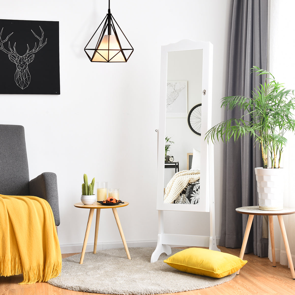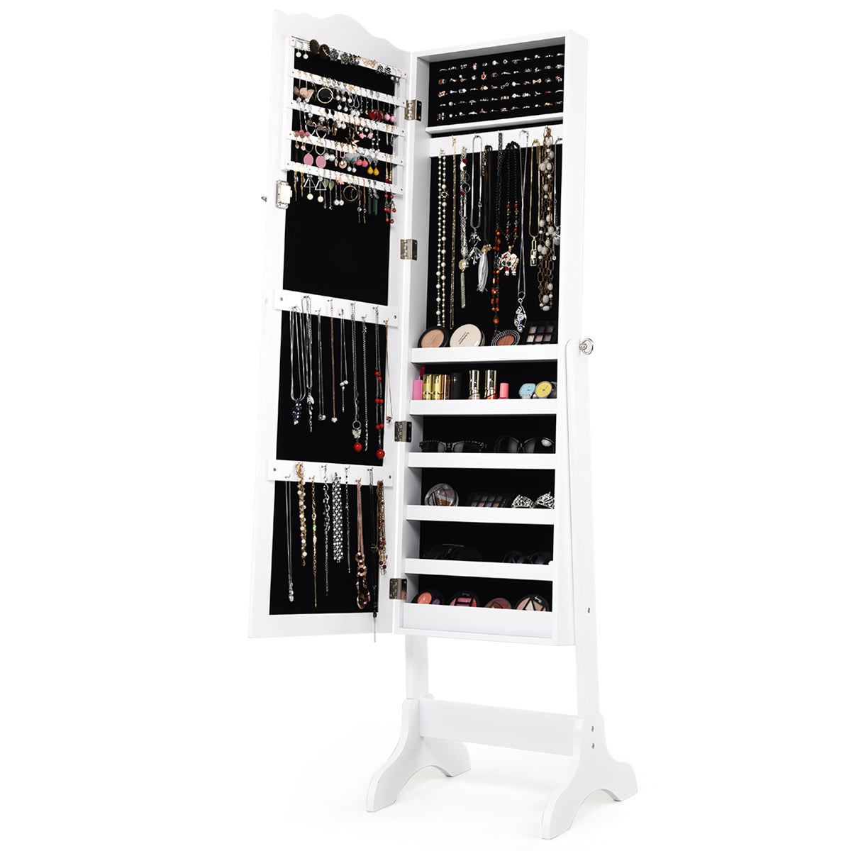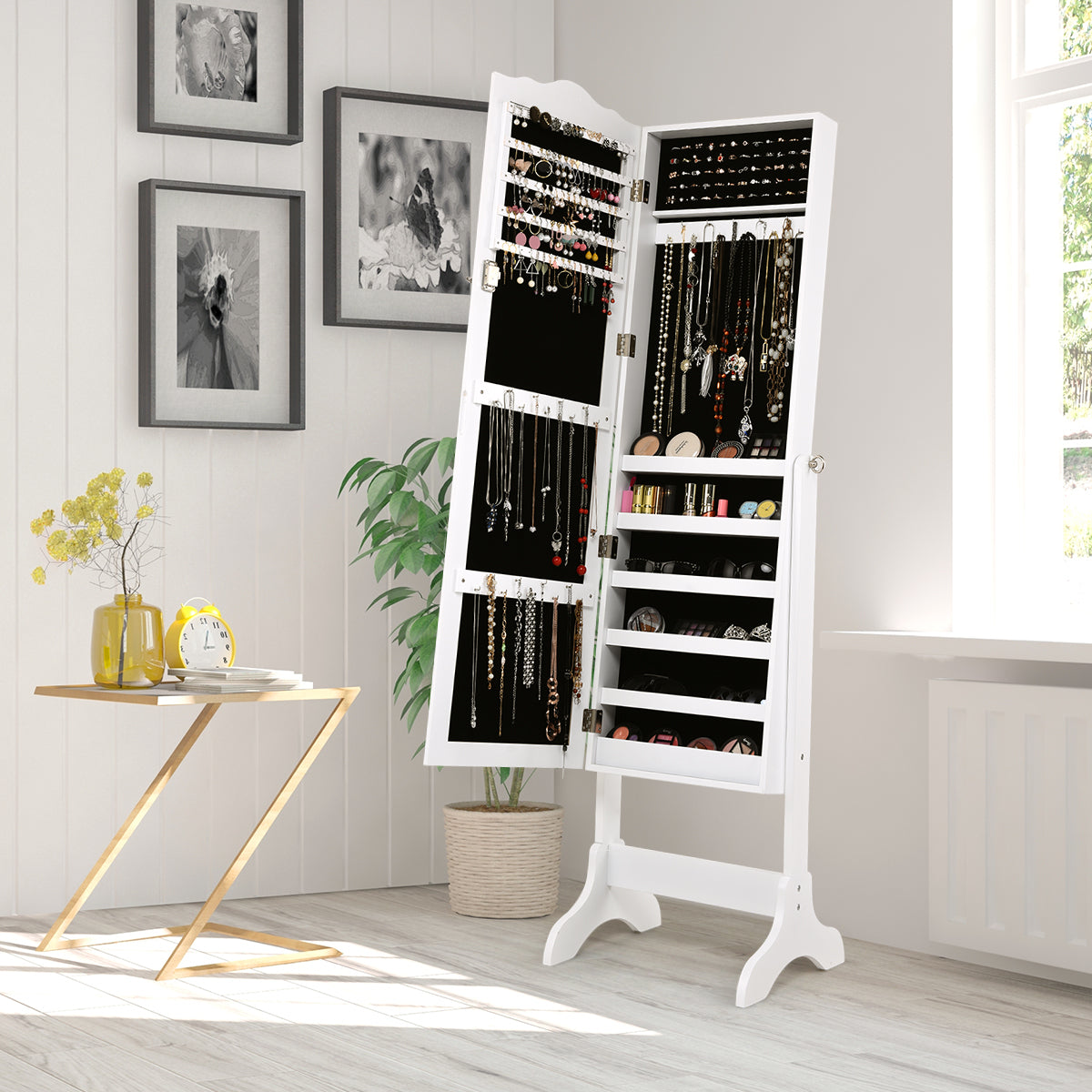 Take a look at our this lockable jewelry cabinet. With support stands, it can be placed and easily moved wherever you want. And the cabinet body is adjustable in angle as you wish. The glass full-length mirror will give you a clear head-to-toe view which is perfect for daily makeup routine. It provides tons of space inside to sort and organize all your jewelry and the soft velvet lining makes sense in reducing scratches on jewelry as well as air oxidation. It also comes with a nice special lock to keep your jewelry well closed inside.
