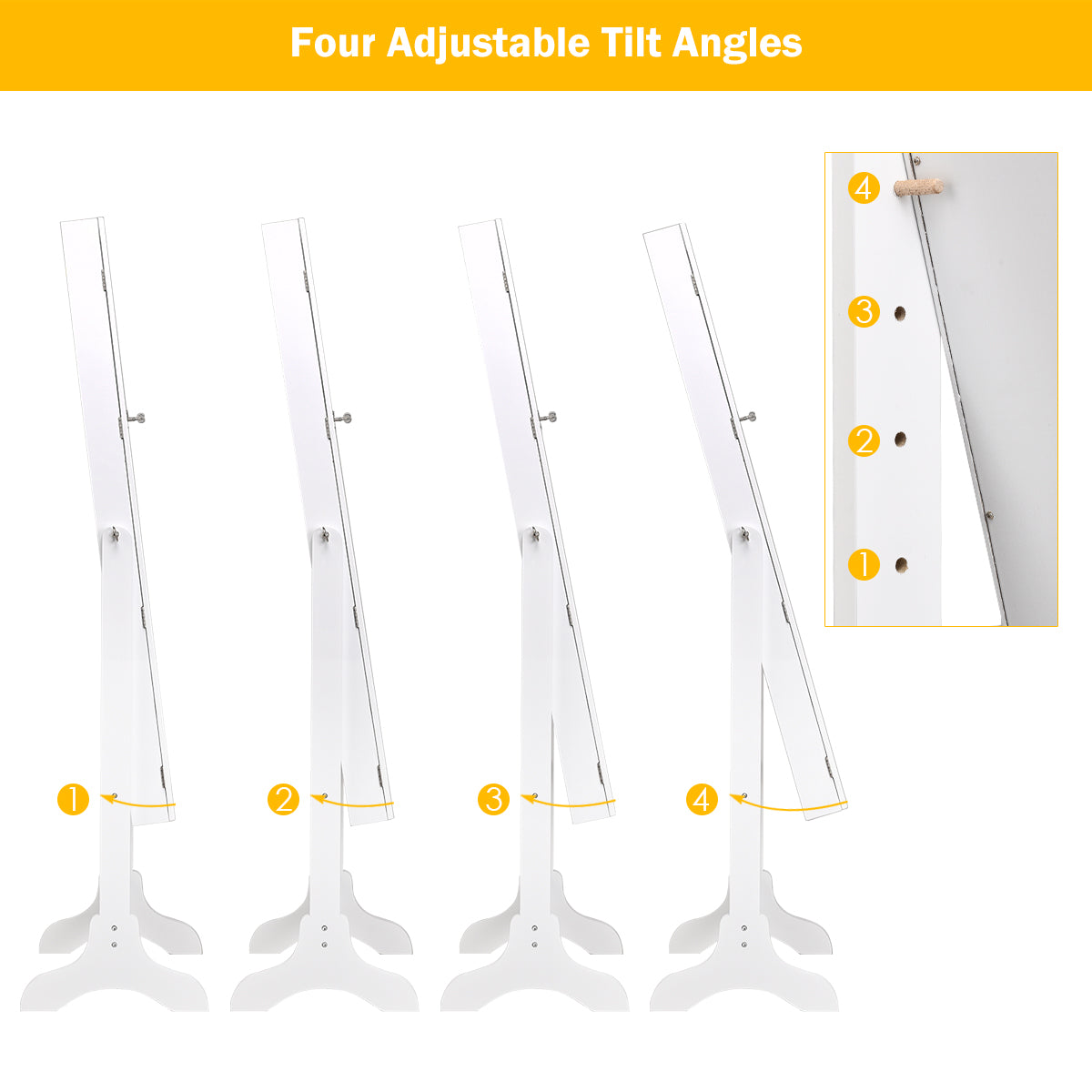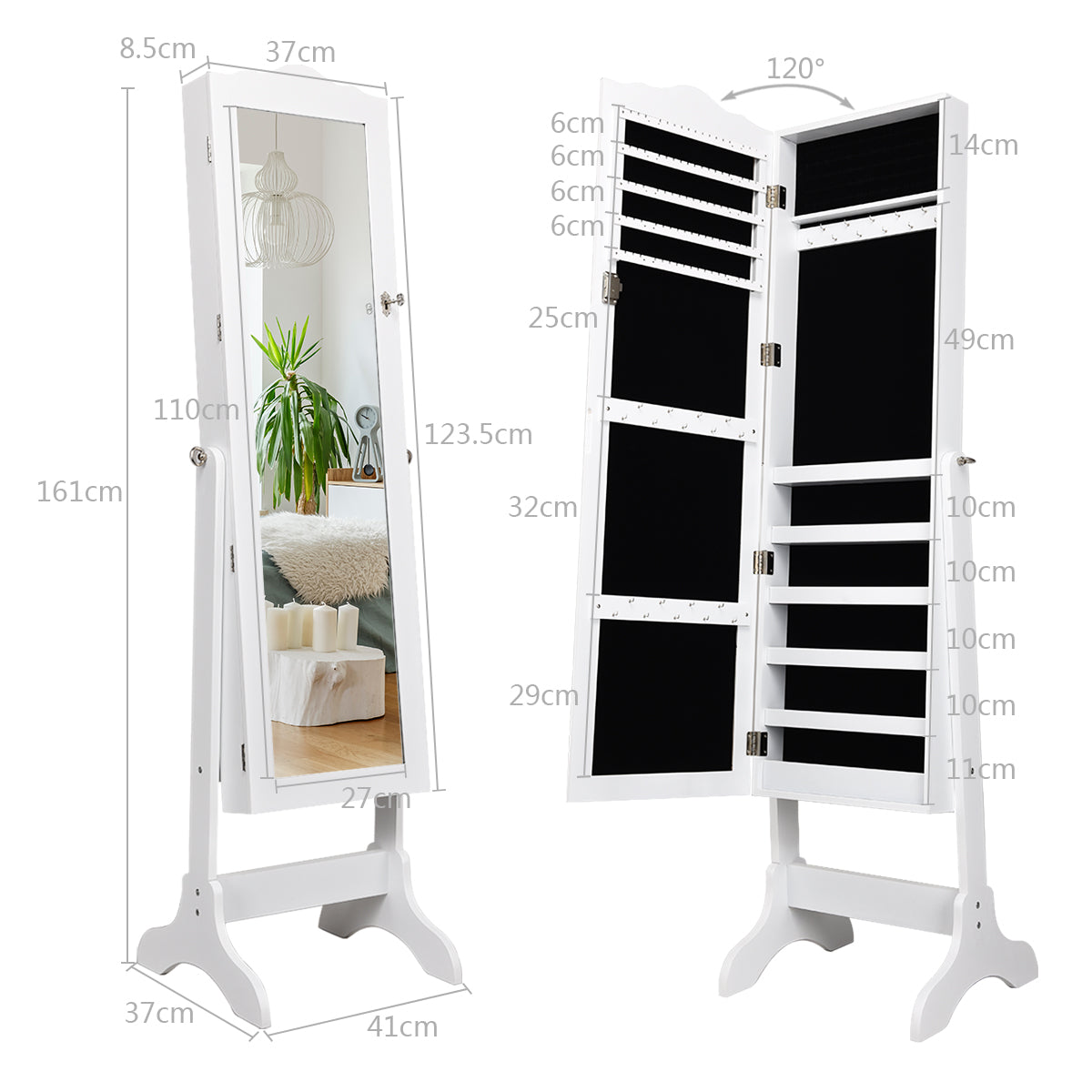 Lockable Door with Embedded Full-length Mirror: When not in use, you can lock this jewelry cabinet with a nice special key to keep your jewelry safe and private. The decorated keyhole is next to the mirror for convenient access. The glass full-length mirror will provide you with a clear head-to-toe view of your outfit.