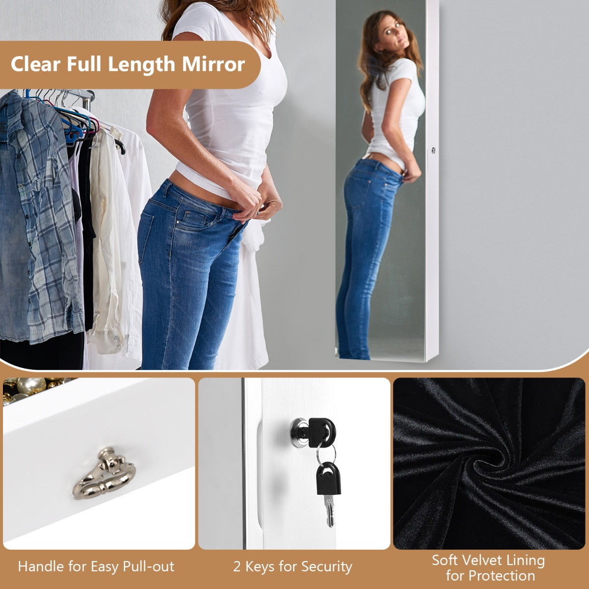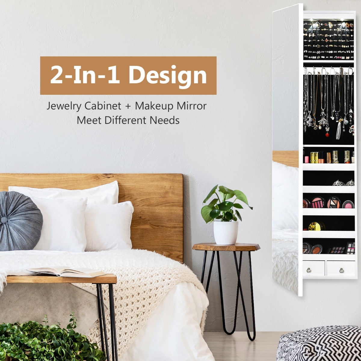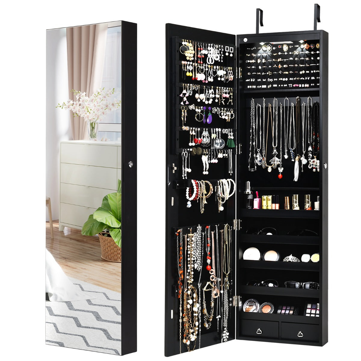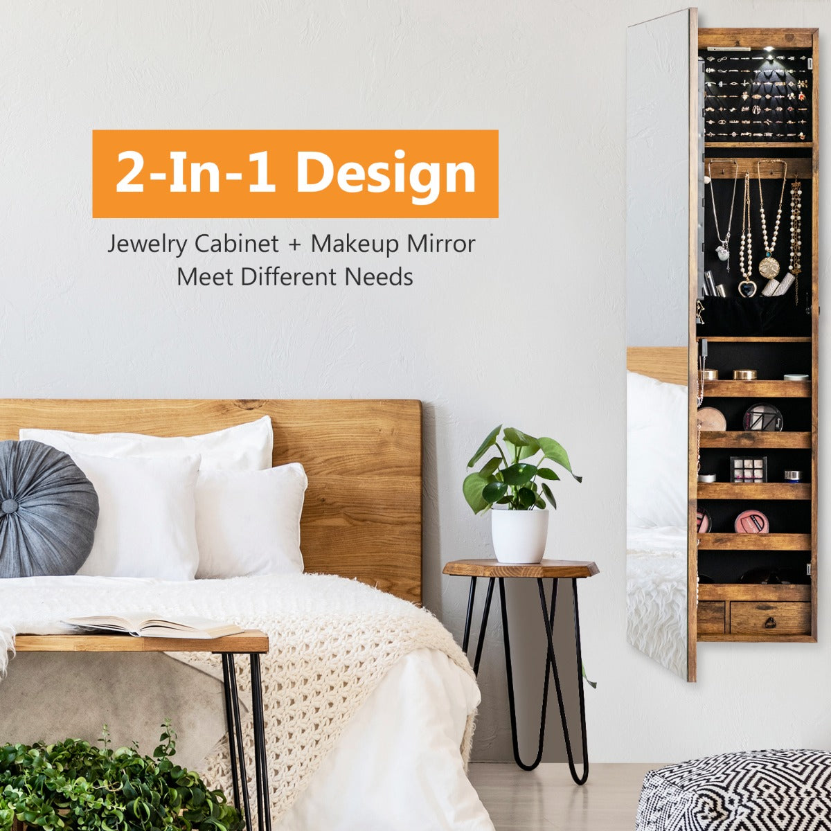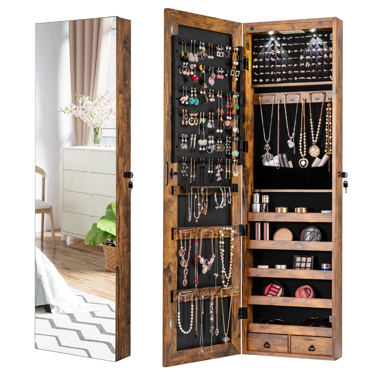 This is our brand new jewelry cabinet with full size mirror and LED lights is an attractive art work. Full size mirror is convenient for trying your jewelry and clothes on, lights add luxury and glory to your cabinet . It is specially designed for your valuables help your jewelry in an organized manner and prevents them from getting tangled. Lockable design ensures the safety of your jewelry. Features door or wall mounted, perfect for compact space and saving your space. What's more, the chic and stylish design make it fits with your bedroom decor. Don't hesitate to buy one!