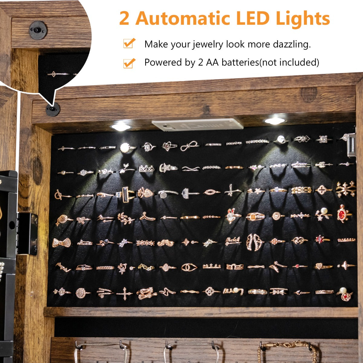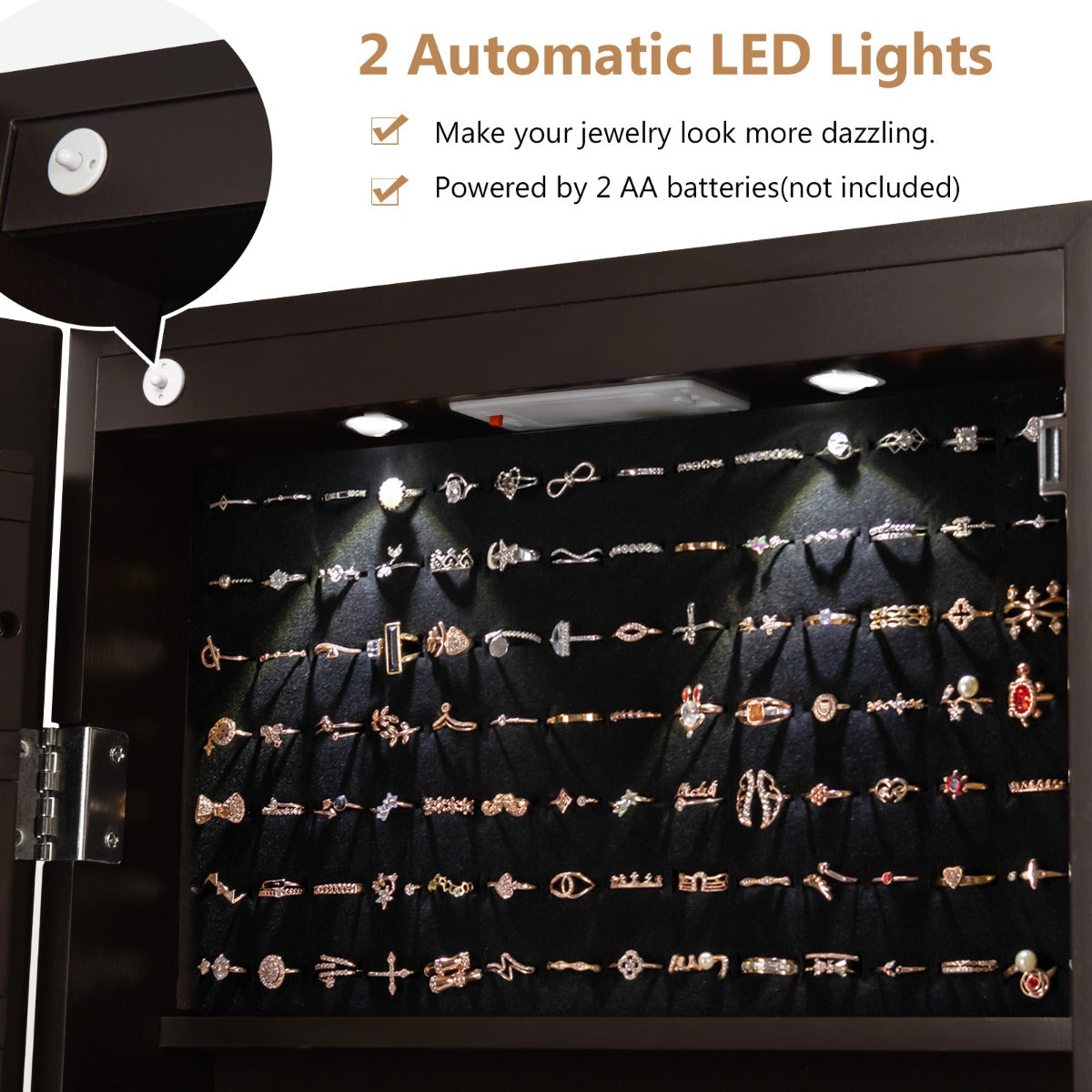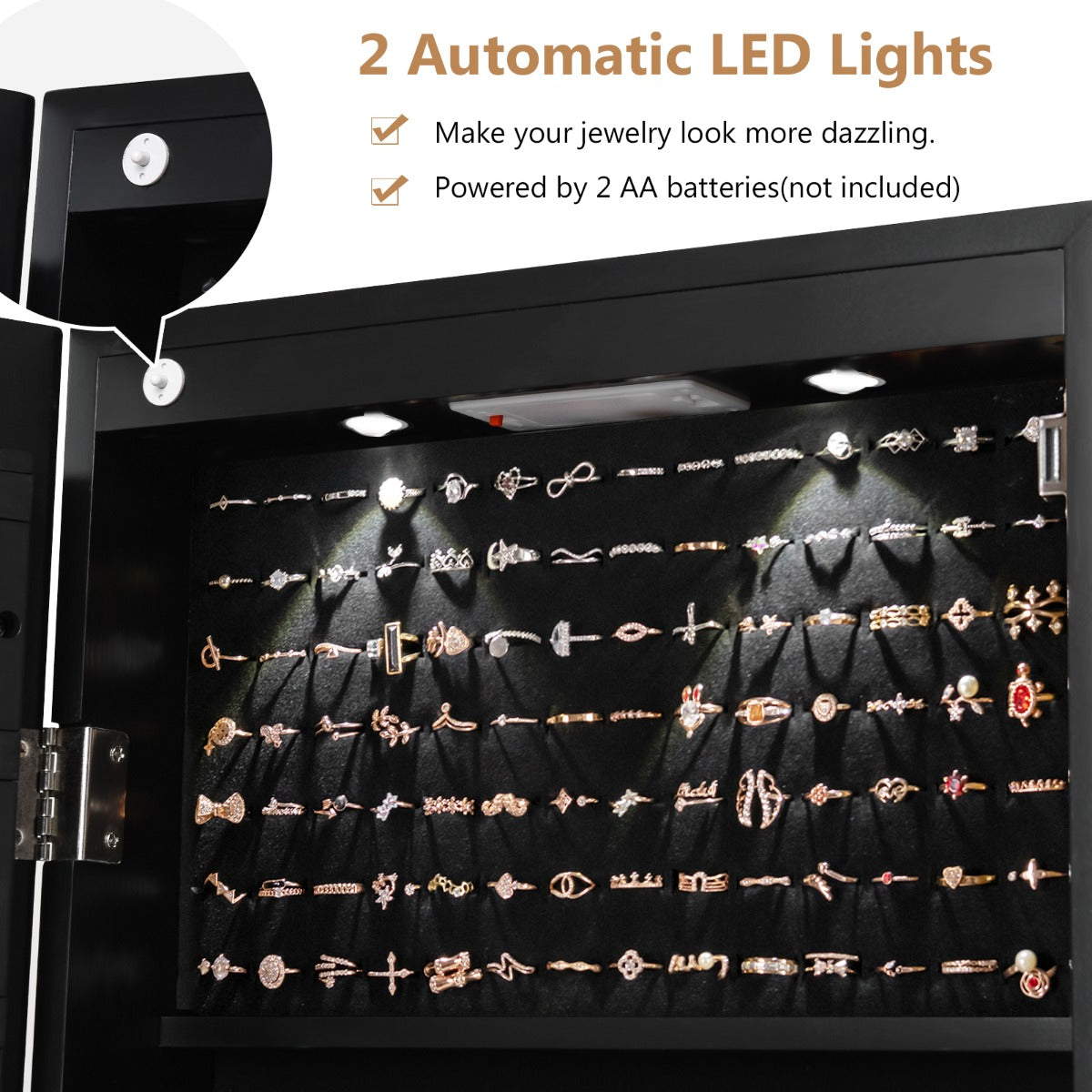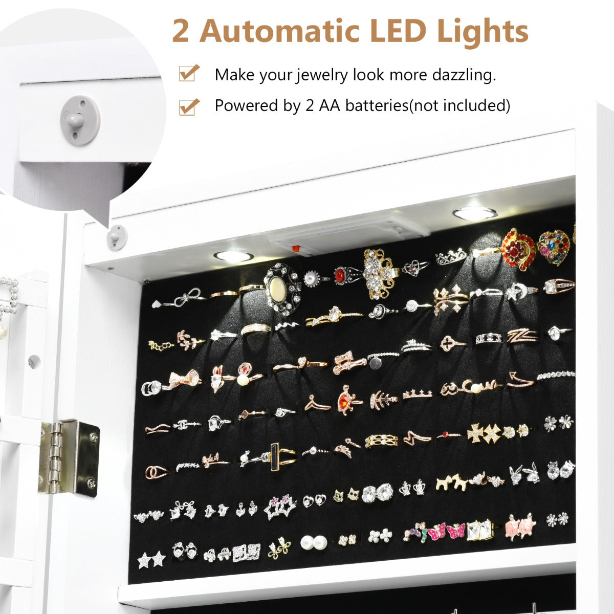 Lockable Cabinet with Auto Light: The package includes 2 keys to allow you to lock the door, preventing dust, falling and improving security. The led lights(powered by 2 AA batteries, not included)turn on and off automatically with the door, letting your jewelry shining and helping you easily get the exact jewelry.