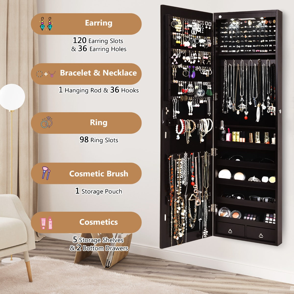 Keep Various Jewelry Organized: With 120 earring slots and 36 earring hole, 36 hooks for bracelets and necklaces, 98 ring slots, storage pouch, 5 shelves and 2 drawers, this mirror jewelry cabinet perfectly stores various jewelries. Besides, the partitioned design ensures tidy organization and avoids tangle.
