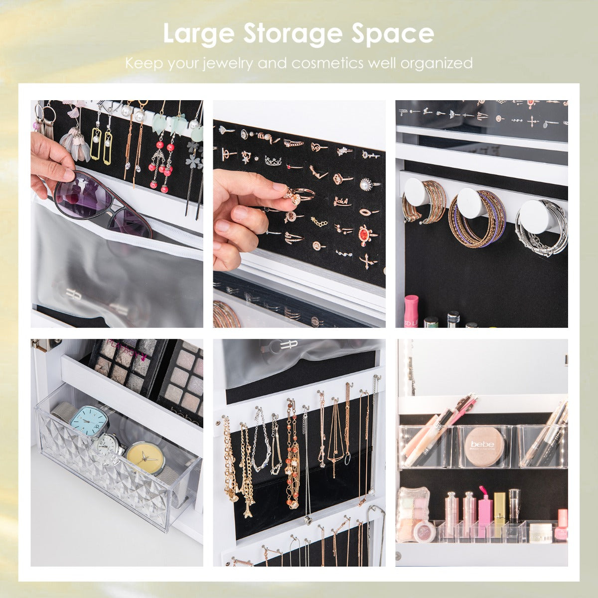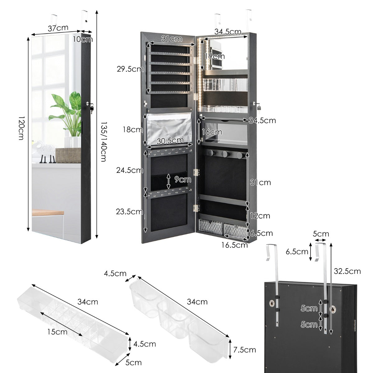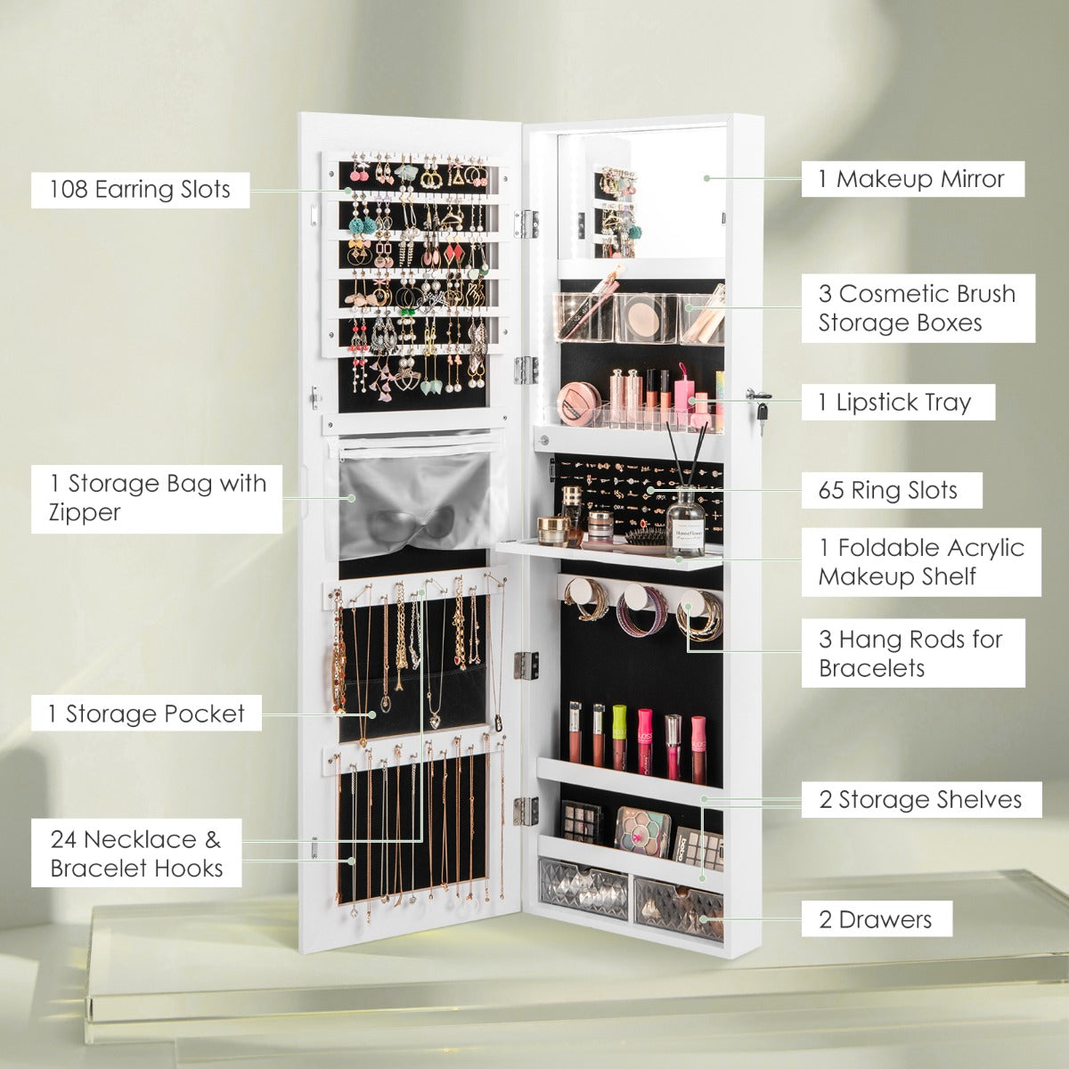Wall Mounted or Door Hanging Jewelry Armoire: You can mount this mirrored jewellery organizer on the wall by using the screws supplied or hang it on the door with the hooks included. 2 adjustable heights are available when hanging the cabinet over the door. Moreover, this mirrored jewjewellerybinet is pre-installed to save time and energy.