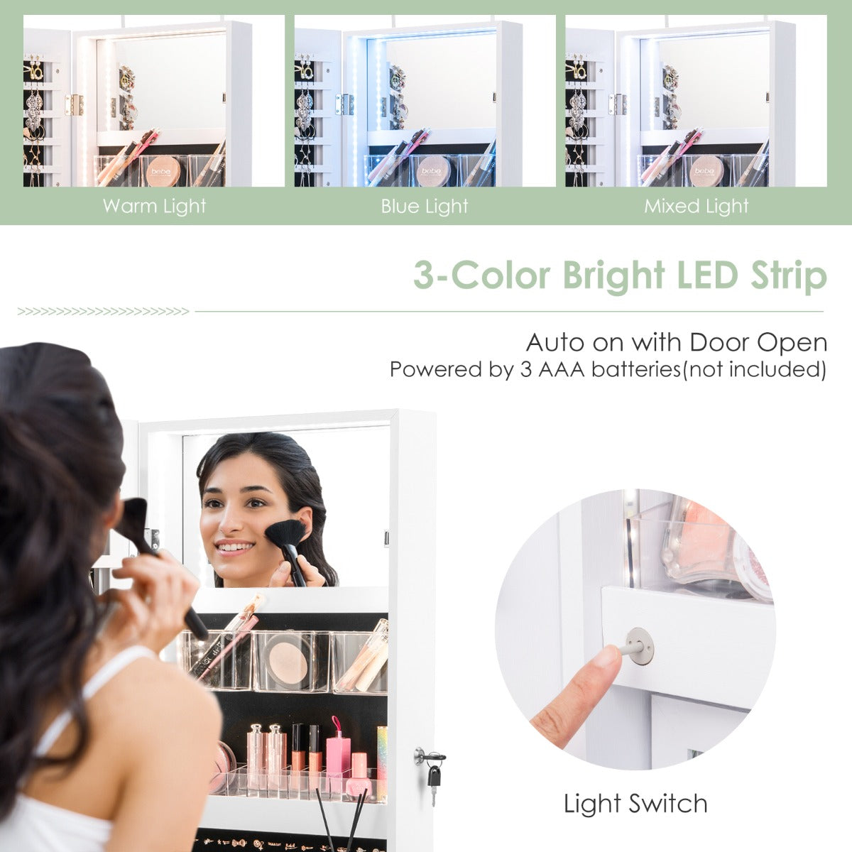 This 2-in-1 mirrored jewellery cabinet with large storage space makes it easy for you to dress and keeps all your jewellery and cosmetics well organized, such as necklaces, rings, earrings, bracelets, sunglasses, watches, lipsticks and so on. The frameless full-length mirror with clear reflection provides a wide view for you to check your daily outfit. Besides, the built-in mirror with a bright 3-colour LED light strip surrounding is convenient for you to select jewellery day or night. And the foldable shelf inside the cabinet is convenient for makeup. This jewellery armoire can be easily hung on the door with 2 hooks or fixed on the wall with screws. Moreover, it comes with a lock and 2 keys to keep children away from your jewellery and prevent unwanted openings.