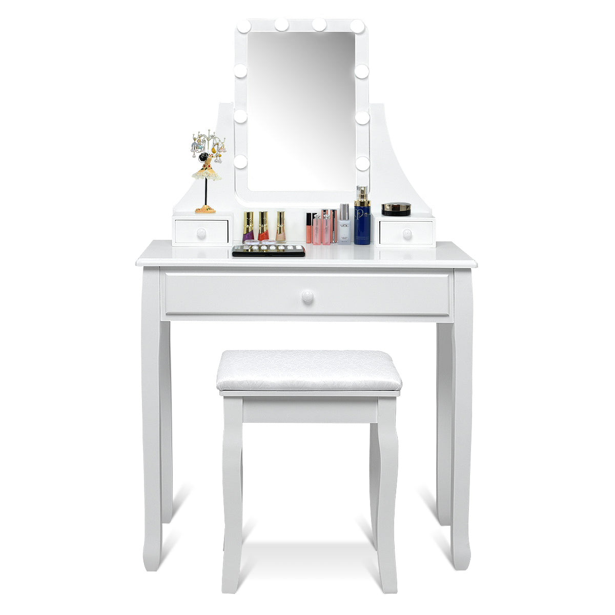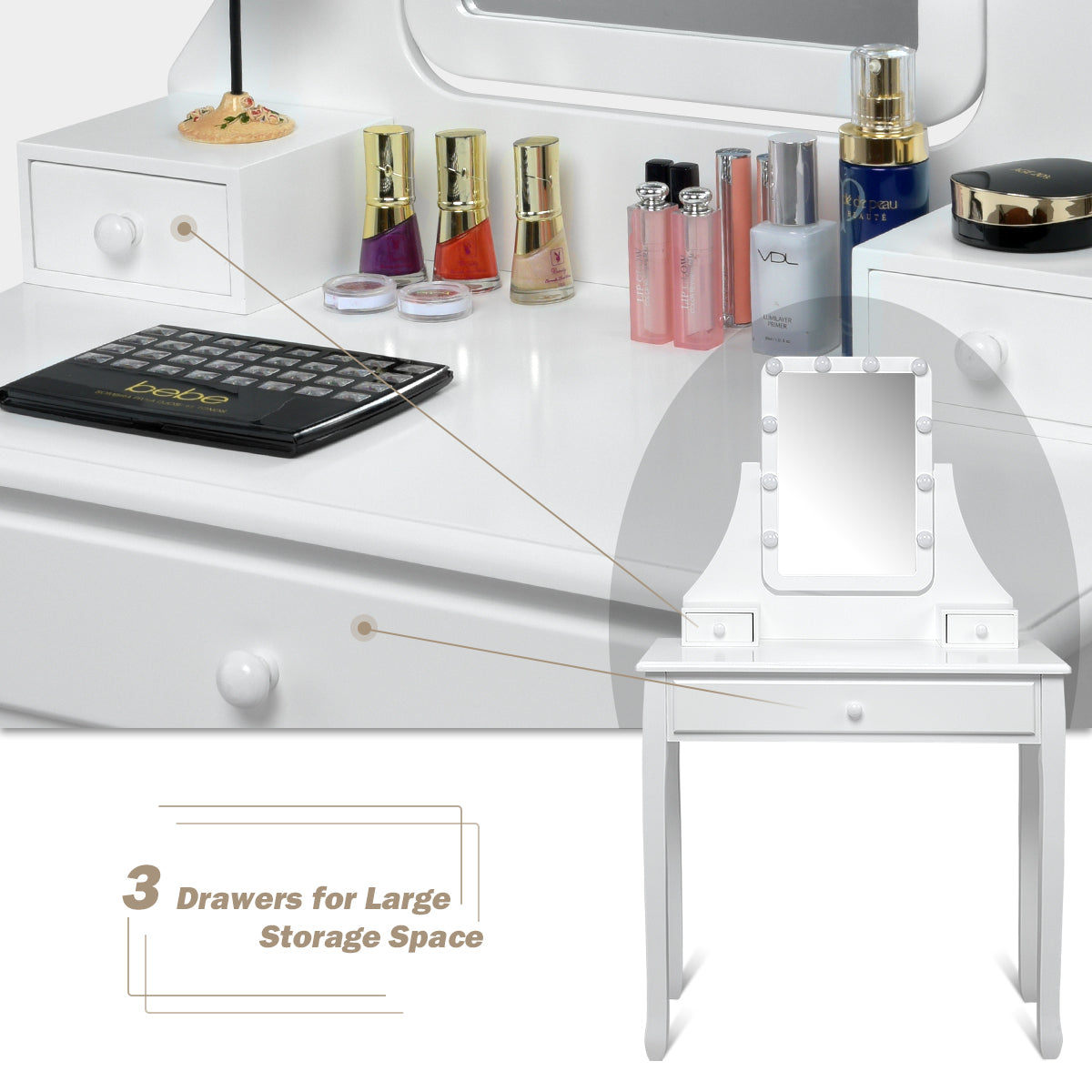 360° Rotatable Mirror with 10 LED Lights : The vanity table set features 10 LED bulbs that can be adjusted for different lighting conditions. The unique memory function enables you not to illuminate the brightness repeatedly after each use. The 360° rotatable mirror gives freedom to position the mirror in the angle you wish.