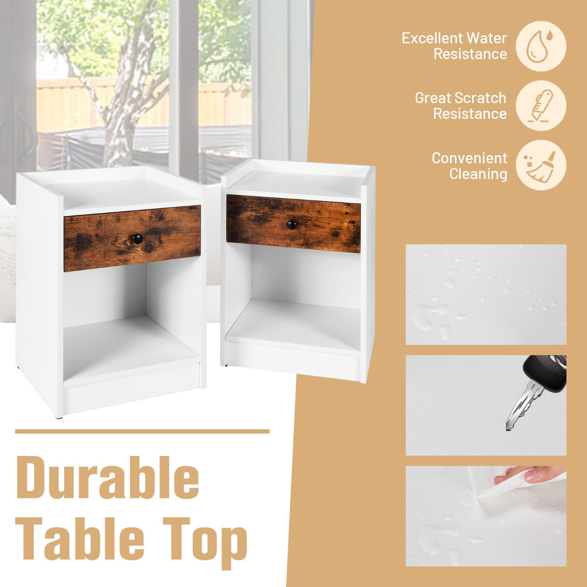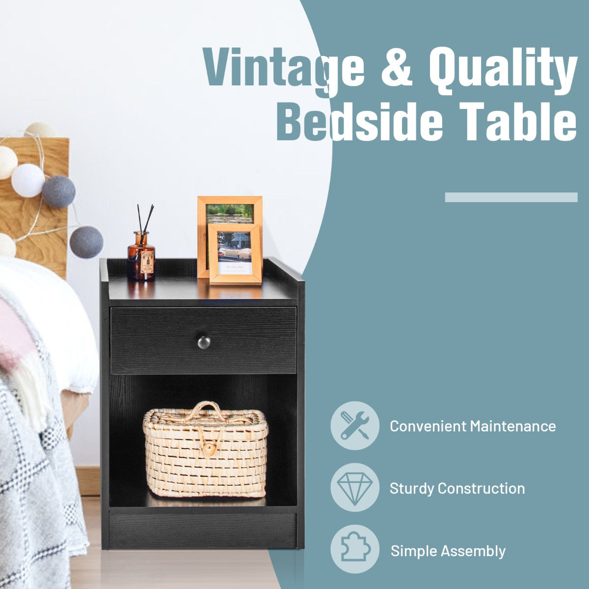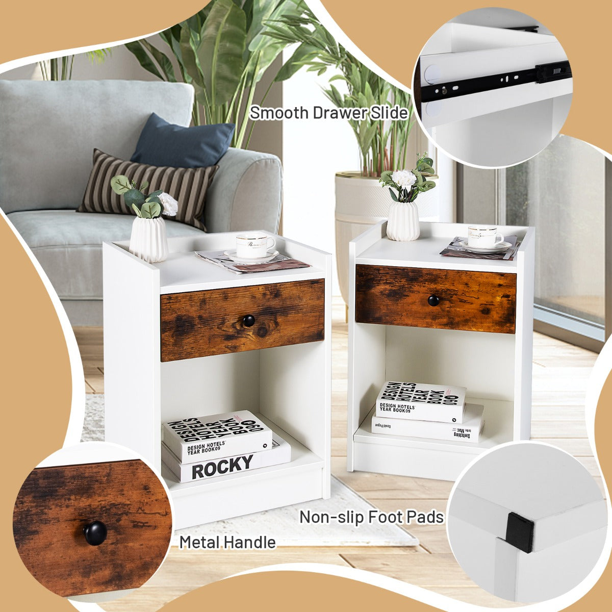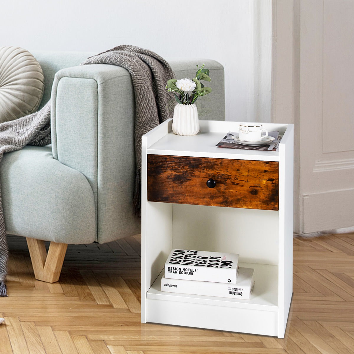 Aussies Market Set of 2 Nightstand with 1 Drawer and Storage Compartment