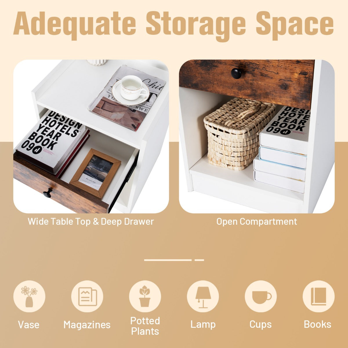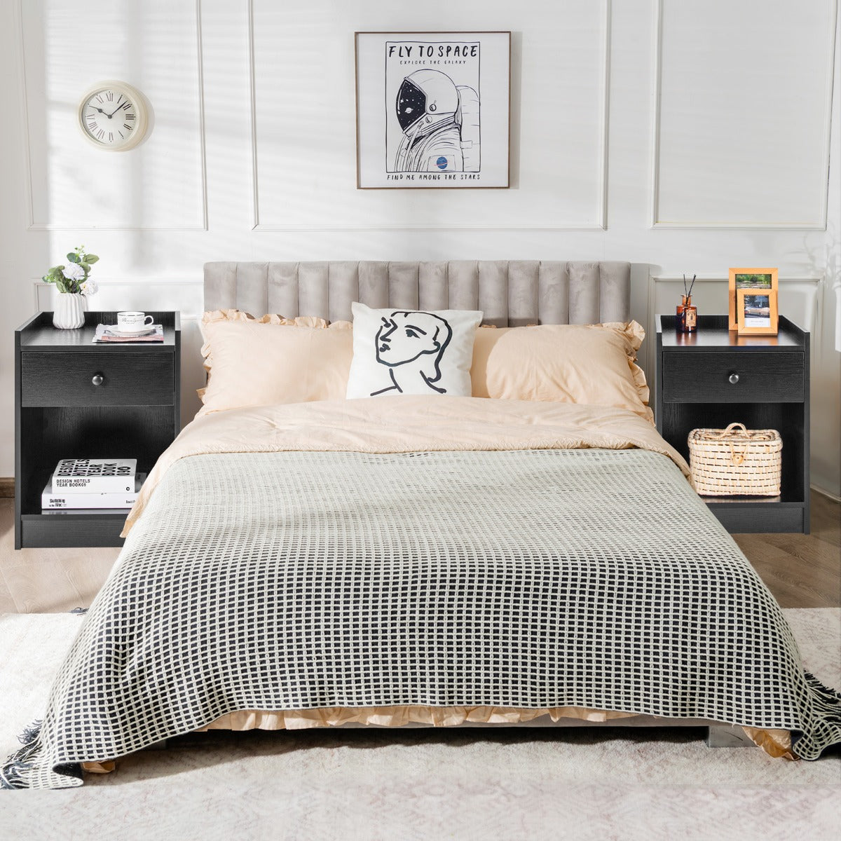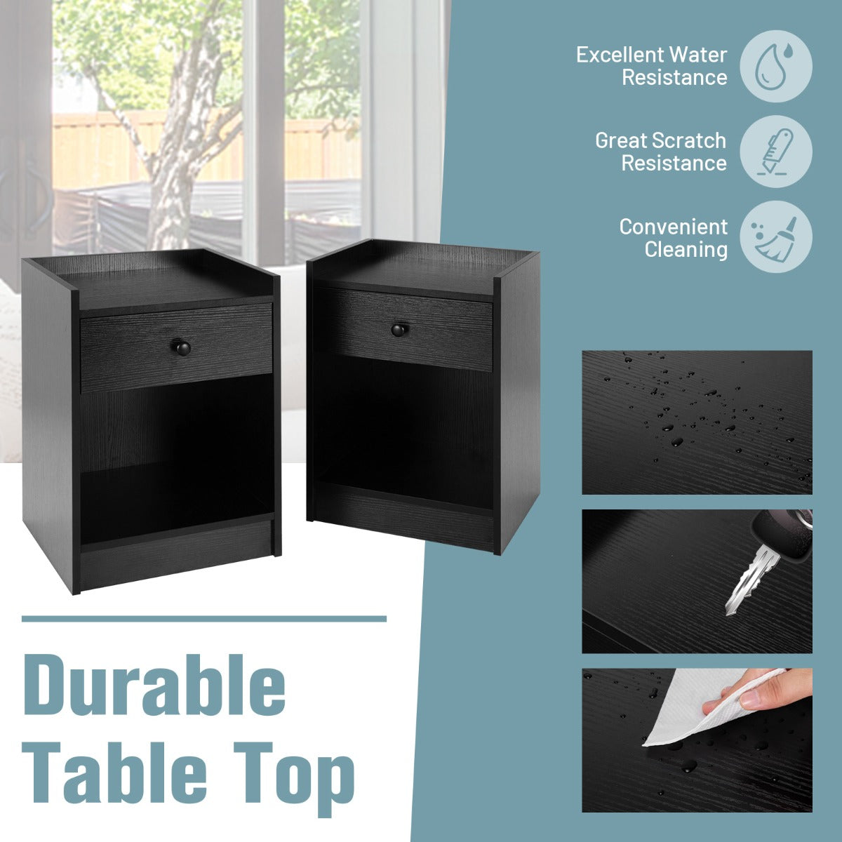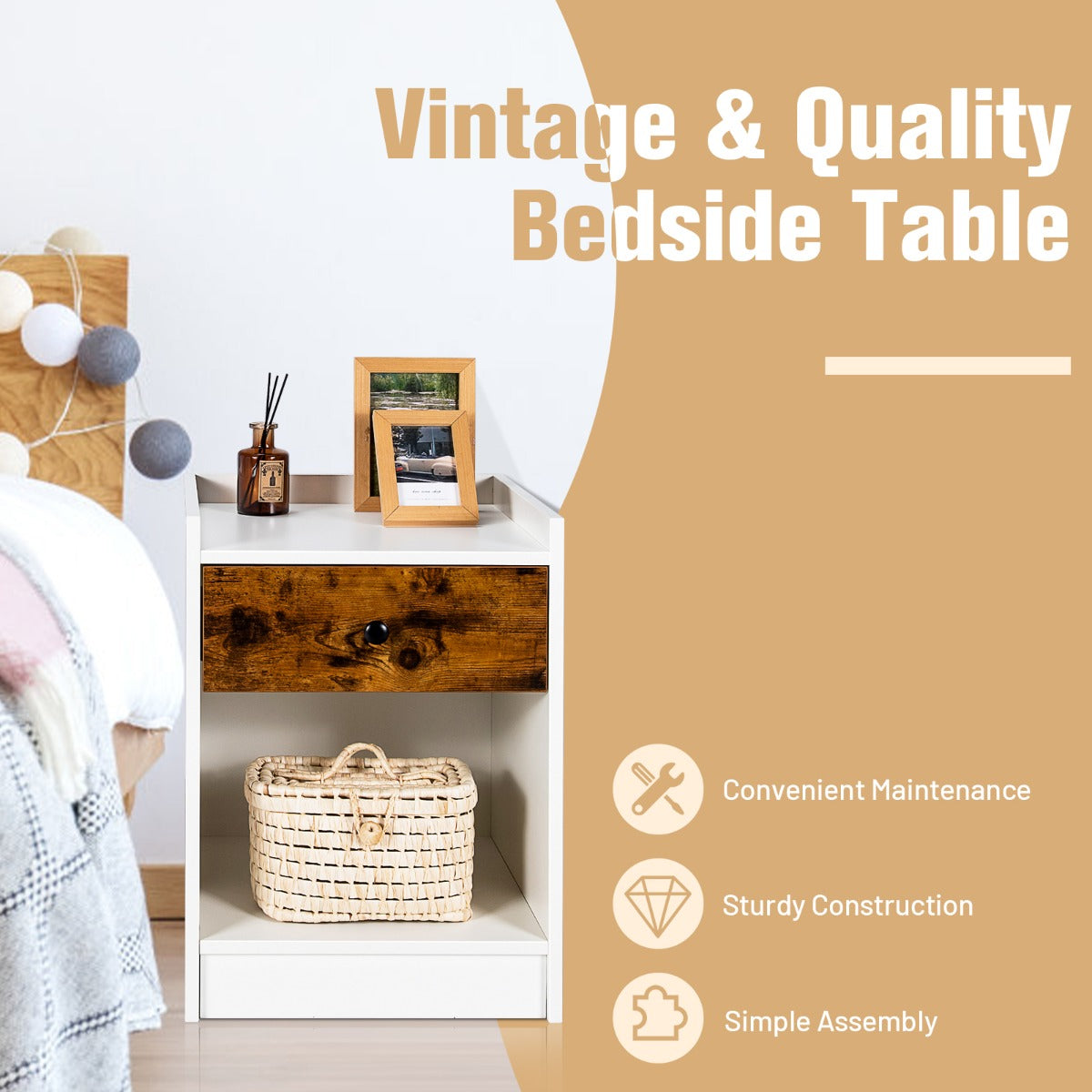 Aussies Market Set of 2 Nightstand with 1 Drawer and Storage Compartment