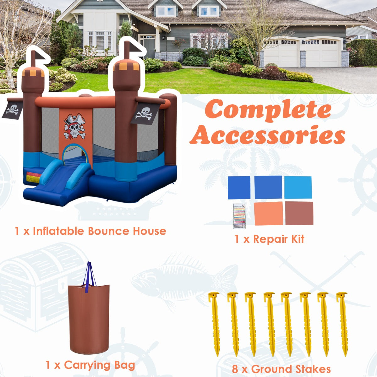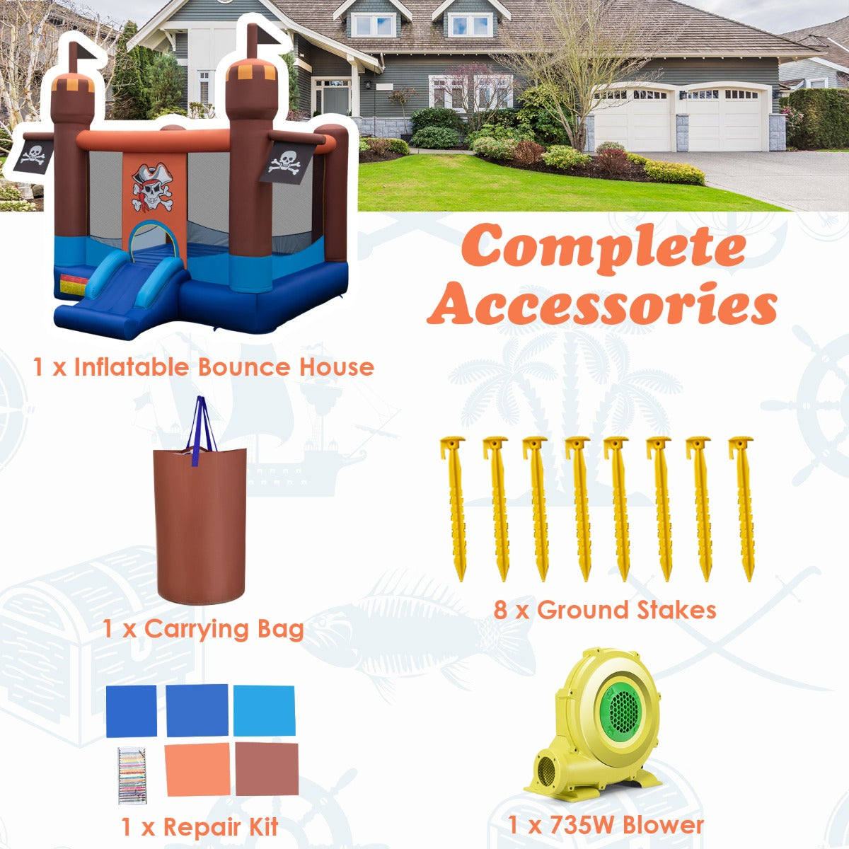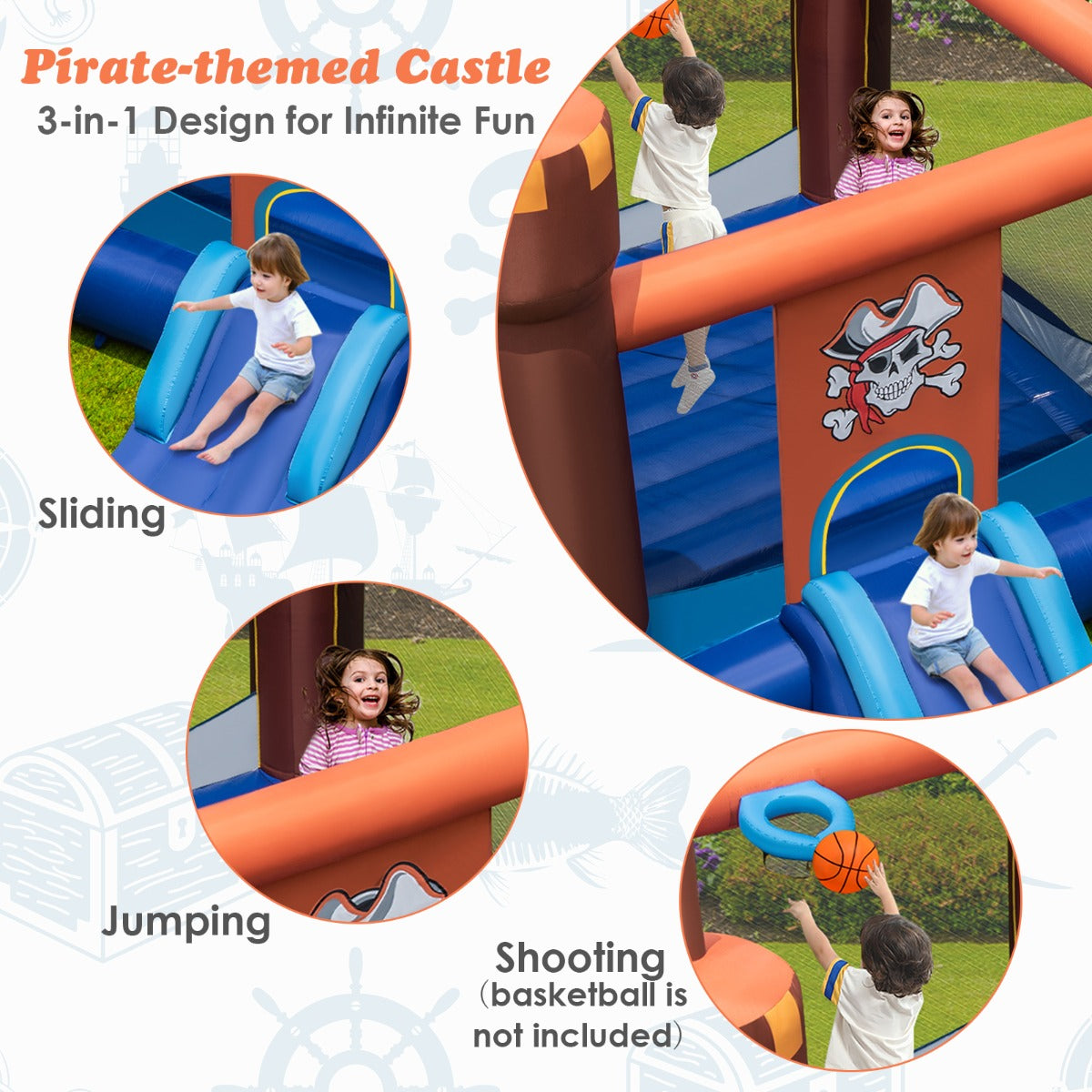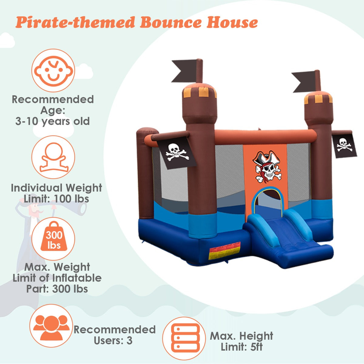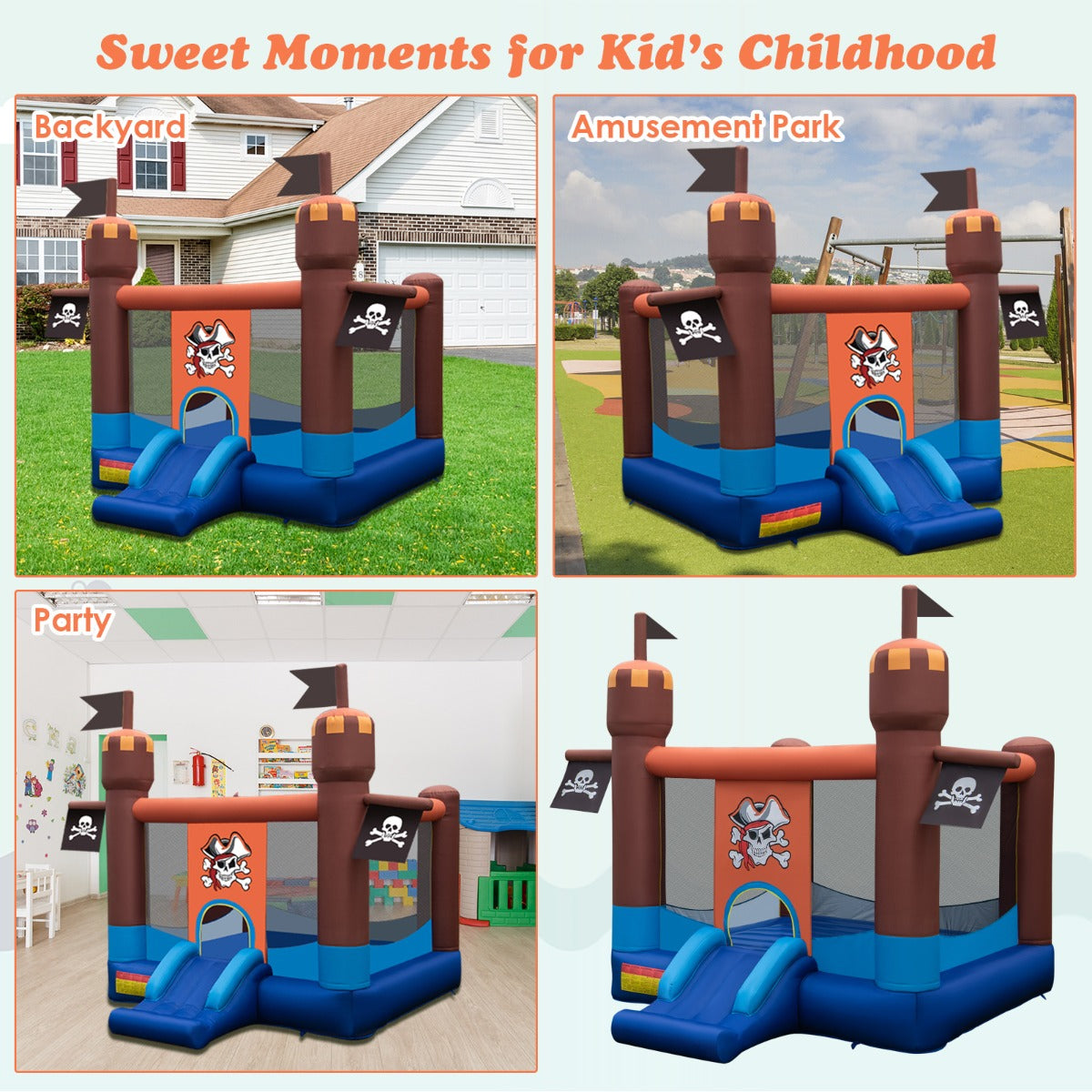 Stylish Design & Gift Idea: This pirate-themed bounce house is designed pirate patterns, flags and bright colors, easily attract children' attention and delight all children. This stylish bounce house is a great gift for your children any time of the year. Perfect for birthday gifts, Christmas gifts or to keep little ones busy whenever.