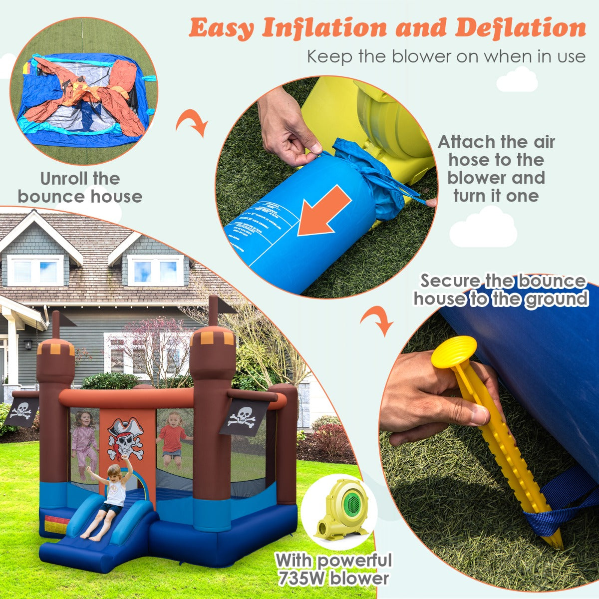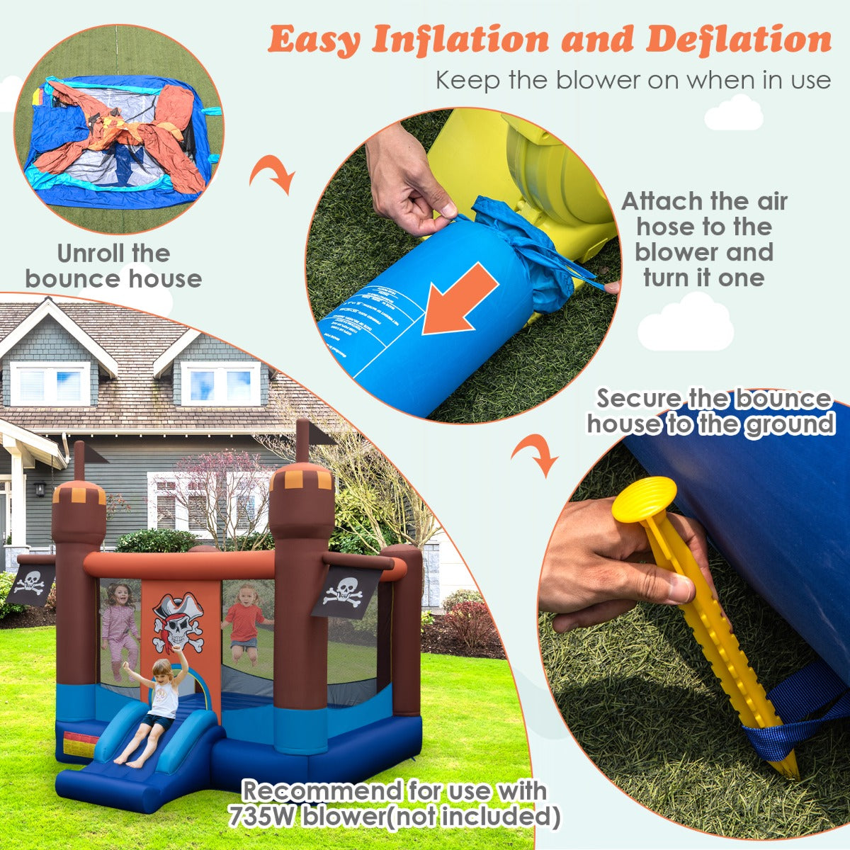 Easy Setup & Portable Design: After connecting the power supply and 735w blower, the bouncy house will be quickly and automatically inflated in a short time. This inflatable bouncer includes the bouncer, repair patches, 8 ground stakes, blower and a portable carrying bag. This jumping castle is portable and perfect for the park, garage, backyard, and indoor etc.