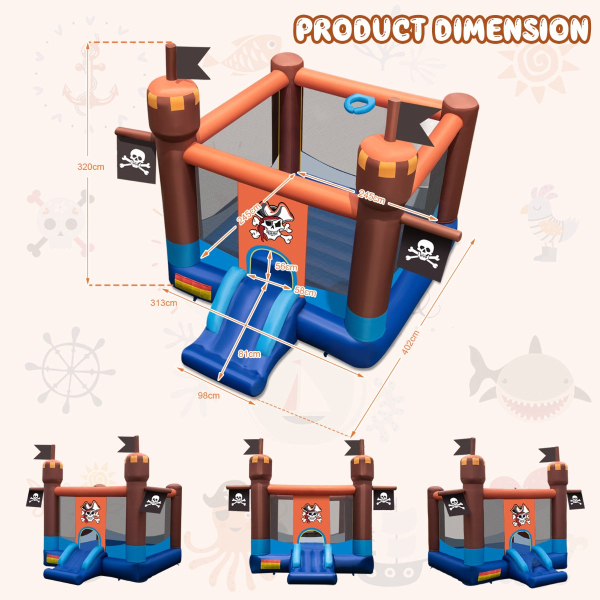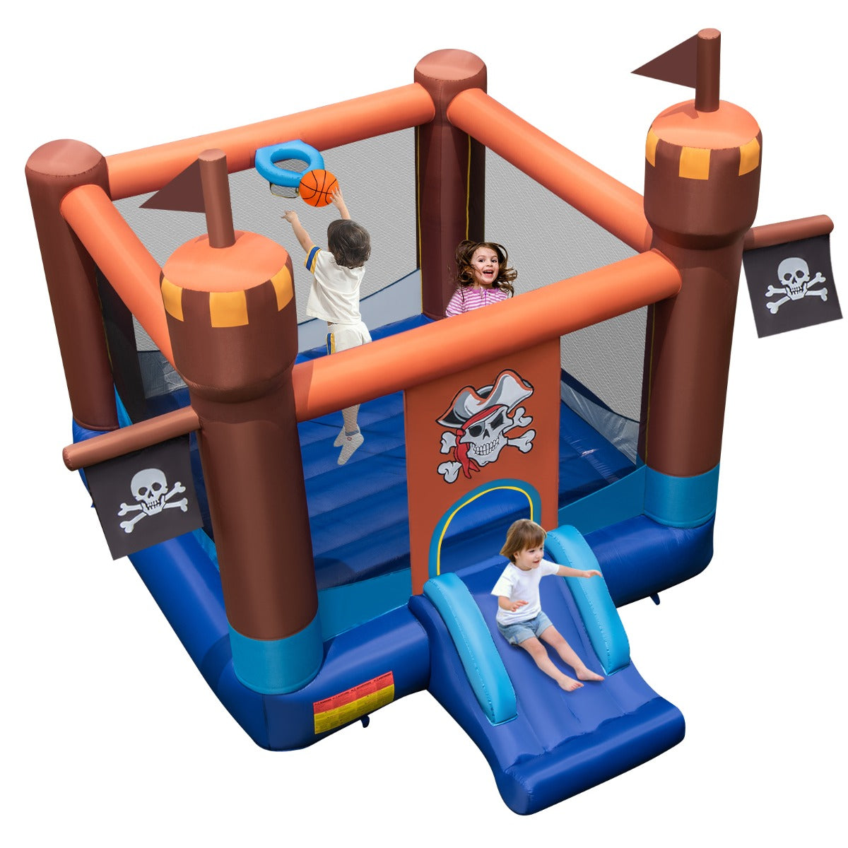 In this charming bounce castle, kids can bounce, slide and play basketball. This pirate-themed bounce house is designed for 3-10 years kids to enjoy endless happiness with their friends for hours. Flags flown off front pillars and stylish pattern on the entrance make it adorable. Spacious jumping area with PVC flooring gives more bouncing freedom. Mesh enclosures provide a safe protection or more bouncing fun. An inflatable basketball hoop allows kid use lightweight balls to shoot while bouncing. Kids can slide all day and feel protected with safety railings and strong material. The entire bounce castle is made of high-strength oxford cloth with perfect tear resistance and wear-resistance. It comes with ground stakes for securing the stability of the castle bouncer. With portable carry bag, easy to take it to yard, park, lawn, etc.