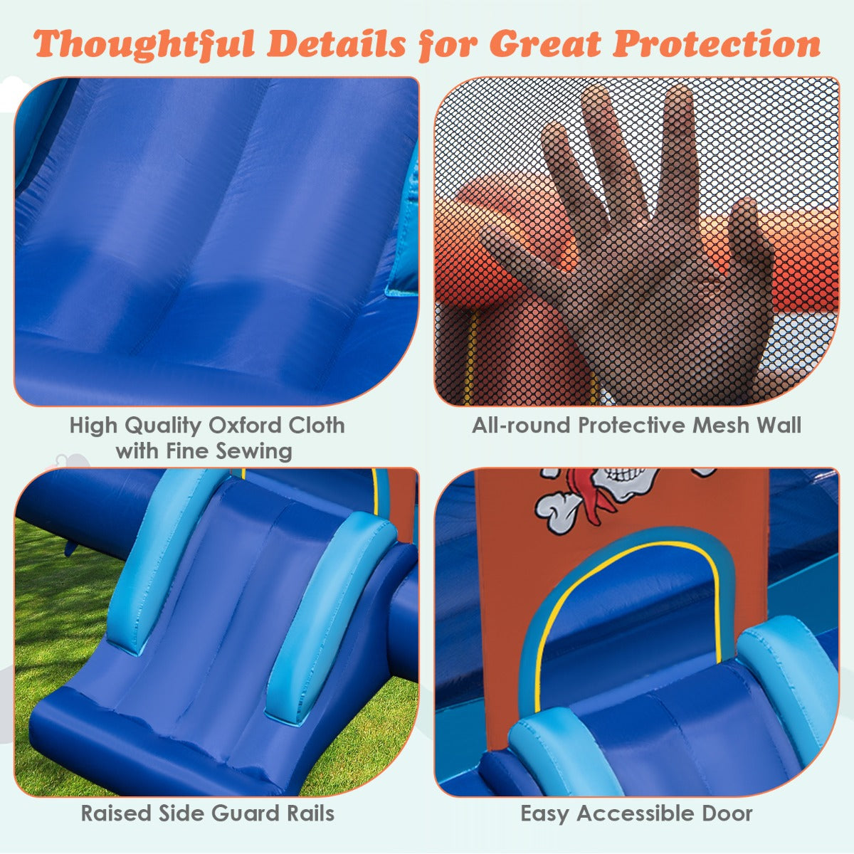 High Quality Materials: This inflatable bouncy castle is crafted with high quality 420 D oxford cloth that is wear resistant and tear resistant for long lasting performance. And doubly reinforced sewing techniques increase durability. Besides, the bouncing mat PVC coating improve water resistance and withstanding more intense jumps.