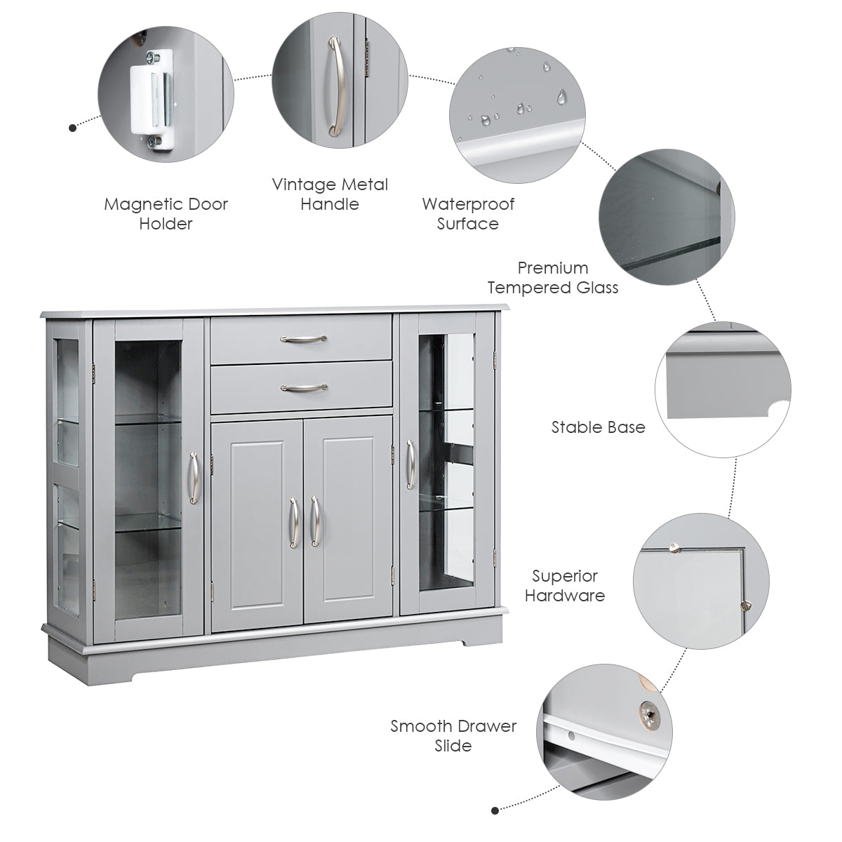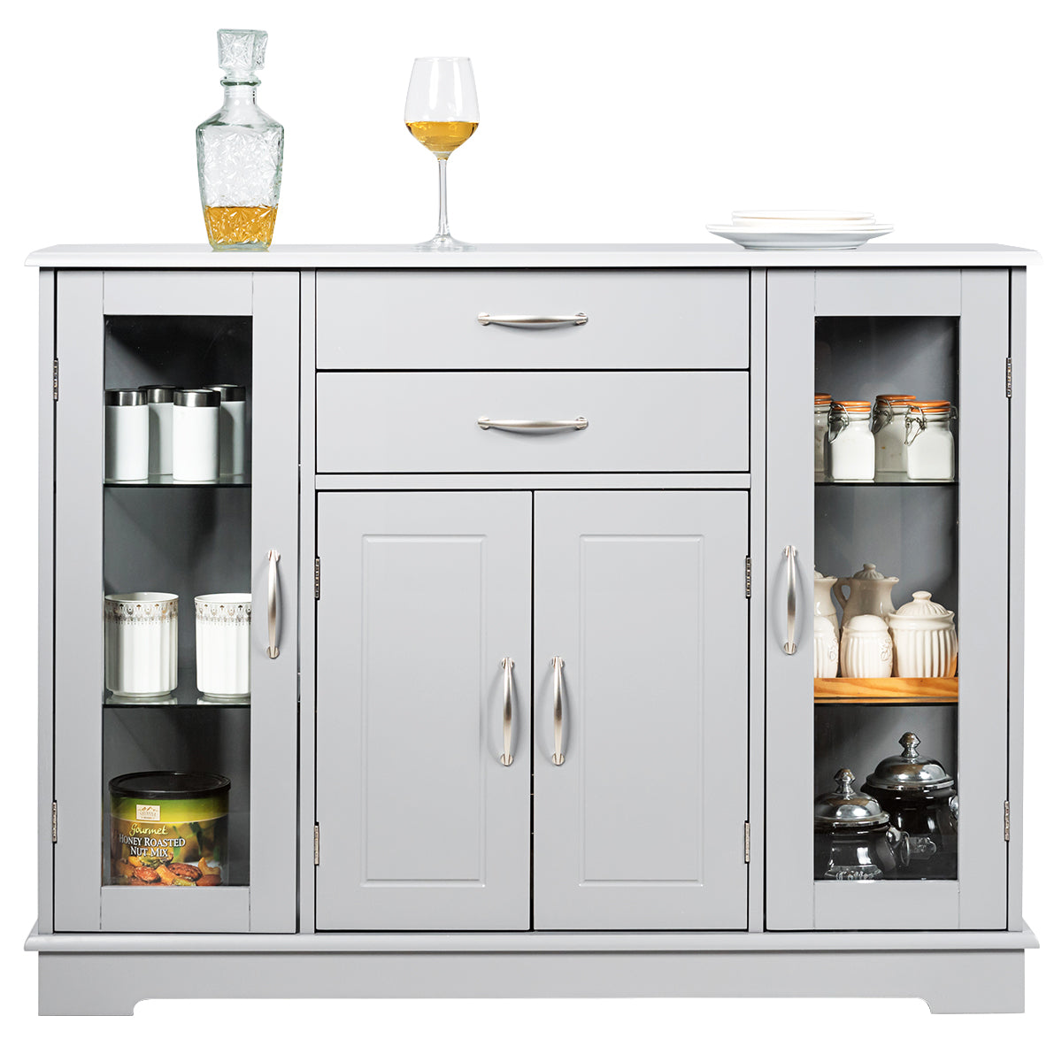Do you need extra storage for your kitchen utensils? Our white wooden buffet server cabinet will be your good choice. Crafted with a durable wooden board and tampered glass, this kitchen storage cabinet with extra sturdiness and high strength for a long time using. Specially designed with 2 drawers, 3 cabinets and a spacious tabletop, the sideboard has roomy space to store all your things in parts and orderly. 3 cabinets with adjustable shelves offer great space to accommodate items of various sizes. What's more, the side cabinets with see-through doors for favourite collections displaying. Our simple but stylish buffet cabinet can be paired with different decoration styles, and put in the kitchen, dining room, and entryway.