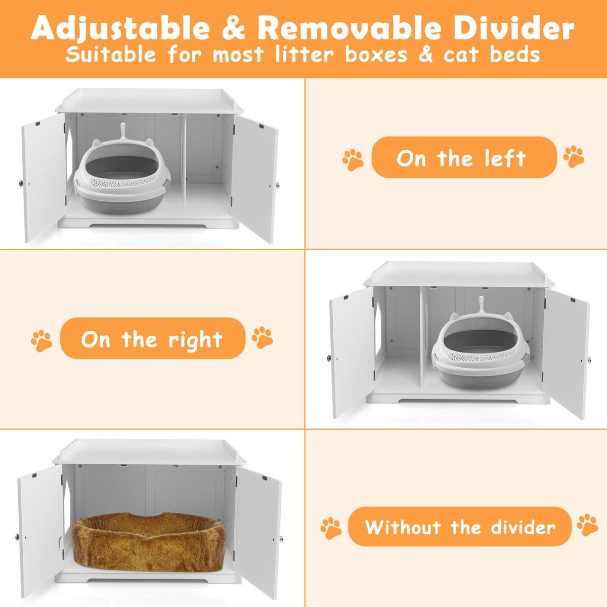 Functional Divider & Side Entrances: The hidden cat washroom is designed with a functional divider that can be adjusted on the left or right, and you can also remove it for creating more layouts. Besides, it features 2 entrances allowing cats to seamlessly slip in and out while ensuing air circulation.
