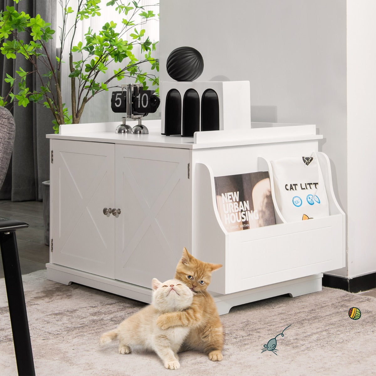 The large side racks allow you to store and organize magazines, cat toys, cat food, etc