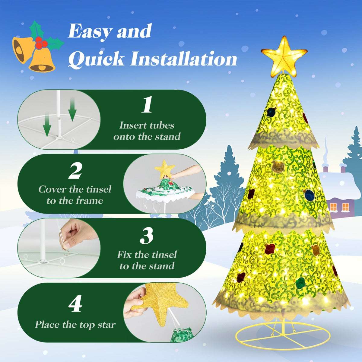 Hassle-free Assembly: Thanks to the pop-up design, our Christmas tree requires only 4 steps to assemble. You just need to insert the metal tube into the base and connect another metal tube, then hang the tree on the support frame, and finally install the LED wire and the tree top star to complete the installation.